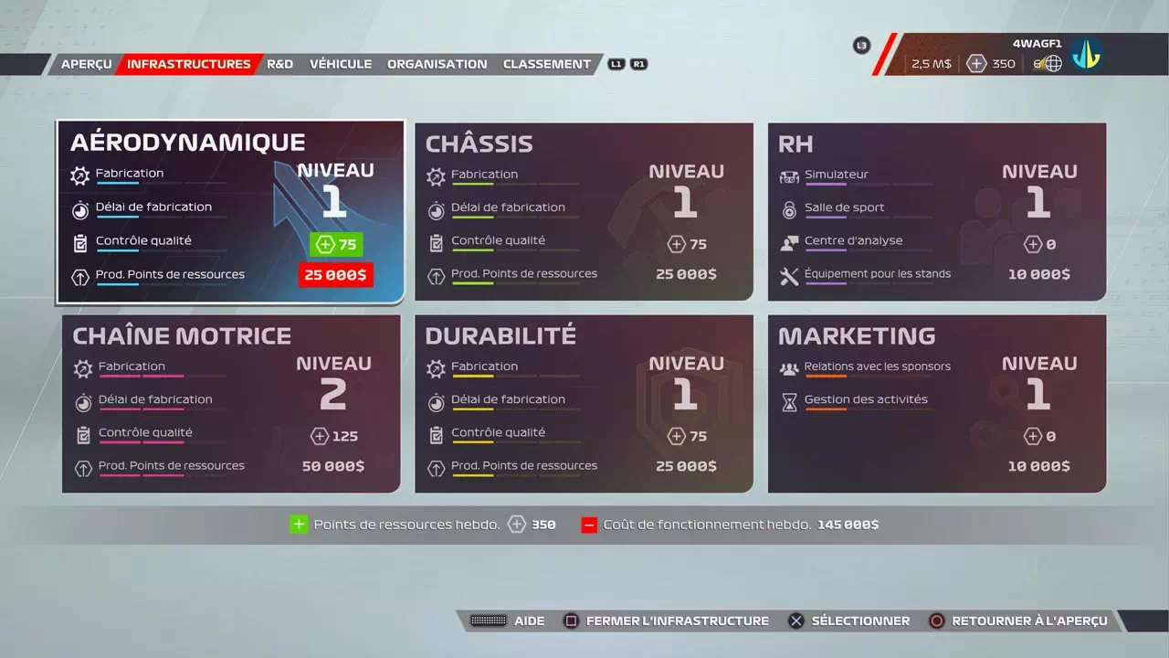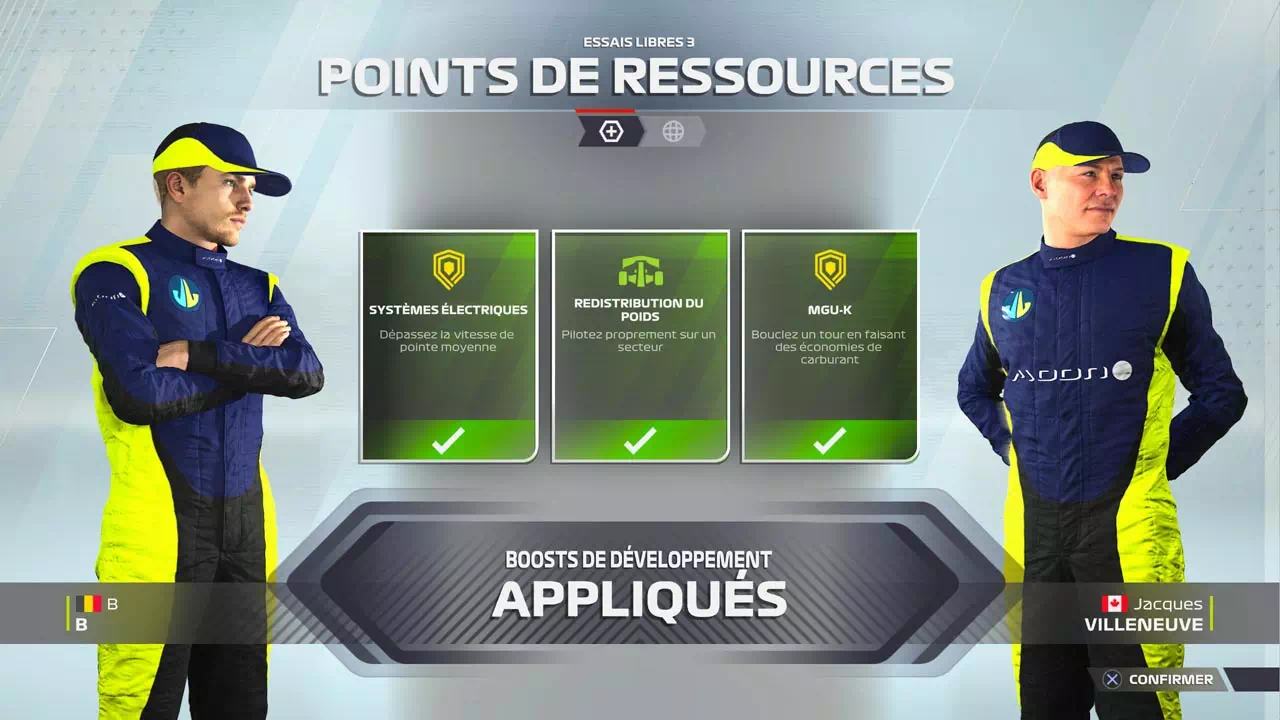 Dans ce mode, le joueur assistera donc à la saison complète de 22 Grands Prix à bord d’une écurie préexistante ou la 11e écurie créée depuis le logo jusqu’à la sélection des recherches du département R&D en passant bien sûr par le podium. Mon écurie force aussi les pilotes de salon à vivre chaque Grand Prix à fond en mettant à profit les séances d’essai pour gagner de quoi avancer dans les recherches techniques sur la voiture et les moyens de l’améliorer. Ces phases de préparation sont très importantes et sont un peu mises de côté dans un mode solo classique.