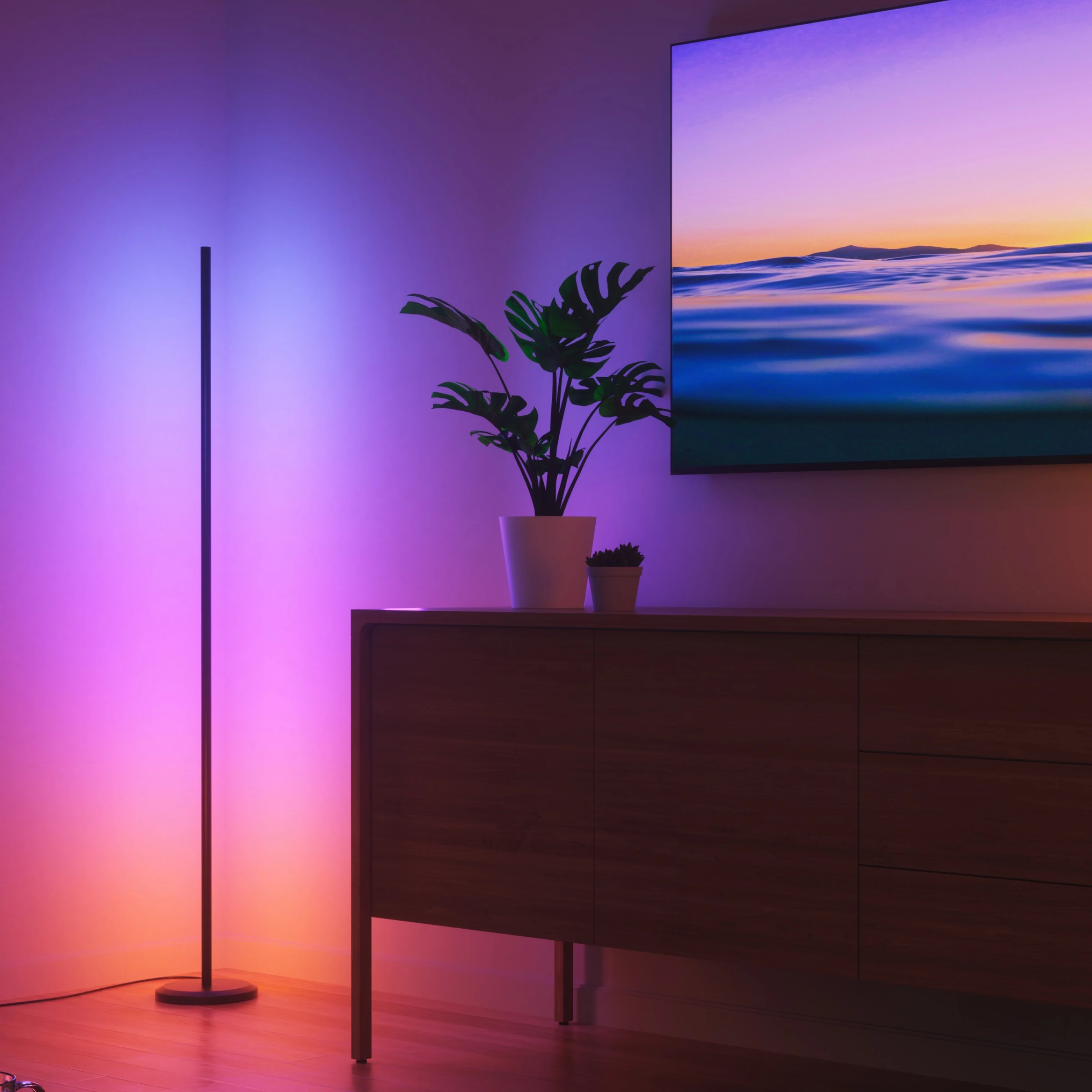Le lampadaire connecté multicolore se montre très fin et offre une belle puissance lumineuse. Avec une épaisseur de seulement 0,75 pouce et une hauteur de 55 pouces, ce lampadaire ultrafin délivre 1700 lumens grâce à 72 LED réparties sur 24 zones. Il offre des tons modulables, parfaits pour une lumière fonctionnelle ou une ambiance relaxante.