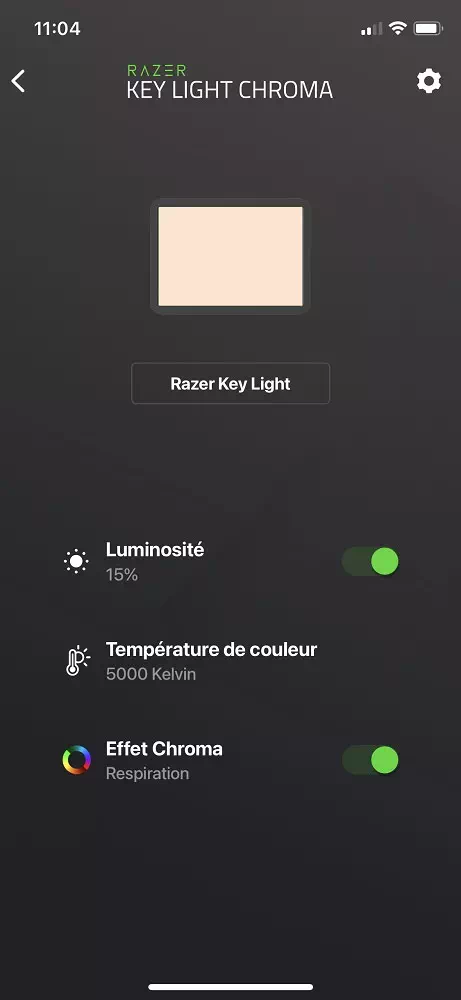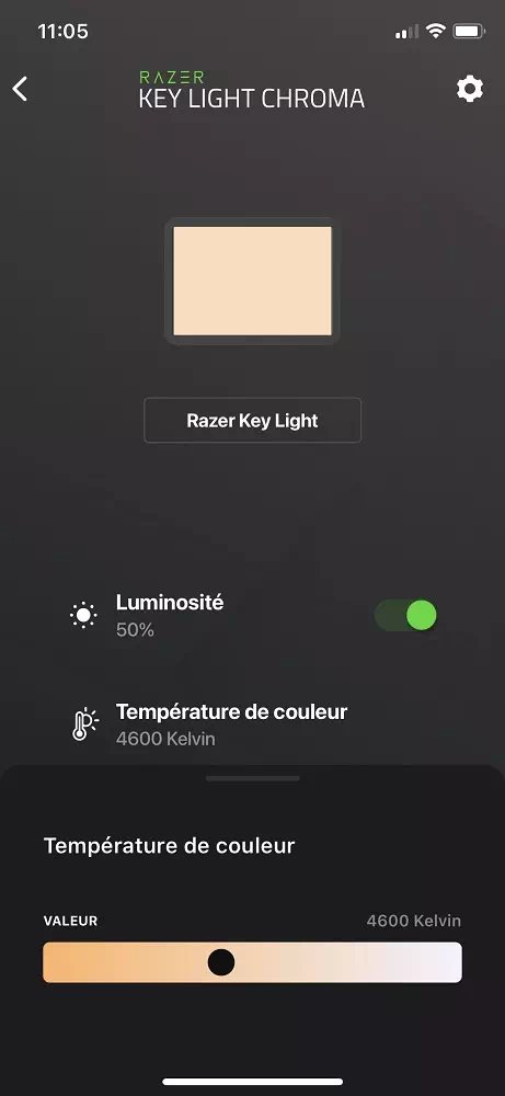 Une fois que le PC ou l’appareil mobile reconnaît le Razer Key Light Chroma, on peut alors changer l’intensité lumineuse, la chaleur de l’éclairage de base ou y ajouter un effet chroma parmi tous ceux que nous pouvons déjà appliquer à un clavier, une souris ou un tapis. Ce modèle de Key light n’a finalement que peu de limites si ce n’est qu’il n’est possible d’afficher une seule couleur à la fois sur le panneau, ce qui nous semble logique. Par ailleurs, il faut aussi souligner que la luminosité est bridée à 15% lorsqu’un effet chroma est activé. Il faut alors régler le curseur un peu plus bas, la luminosité chroma, qui changera alors l’intensité de la couleur et non sa capacité à éclairer une plus grande scène.