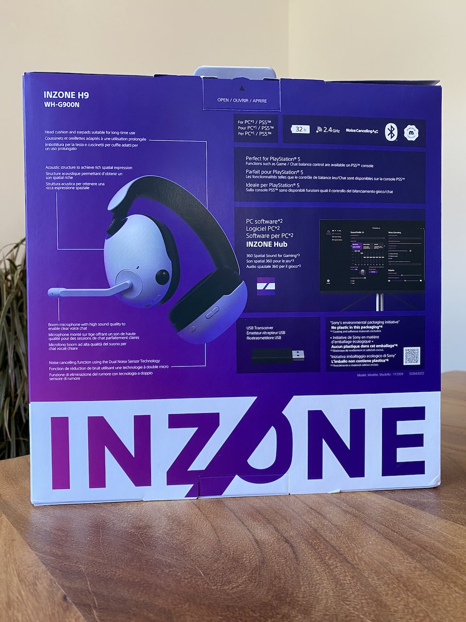Que ce soit pour le H3, le H7 ou le H9, les casques Sony INZONE se démarquent assez bien de la concurrence pour ce qui est du design. Le H9 vient déjà dans un packaging très coloré, teinté de bleu de de violet et assez imposant. On ressent clairement que Sony veut ressortir dans les rayons aux côtés d’autres packaging très colorés également mais sûrement plus petits.