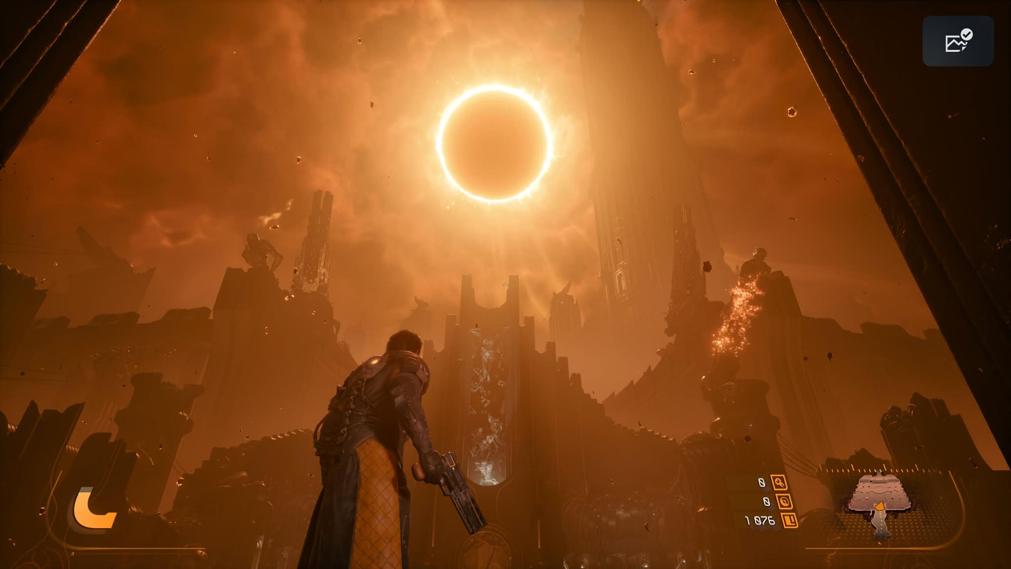 Ce qui rend d’ailleurs Saros vraiment intéressant et qui est l’axe majeur du jeu, c’est l’éclipse. Il s’agit d’une mécanique qui est un élément scénaristique à la fois important pour l’histoire, mais qui en plus ajoute de la difficulté au jeu. En effet, durant vos essais des donjons, vous tomberez face à un verrou gardé par un amas de mains extraterrestre, ce système est un passage obligatoire pour continuer d’avancer et se liera à vous, afin de déclencher l’éclipse.