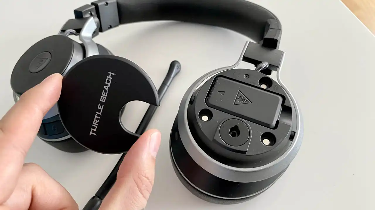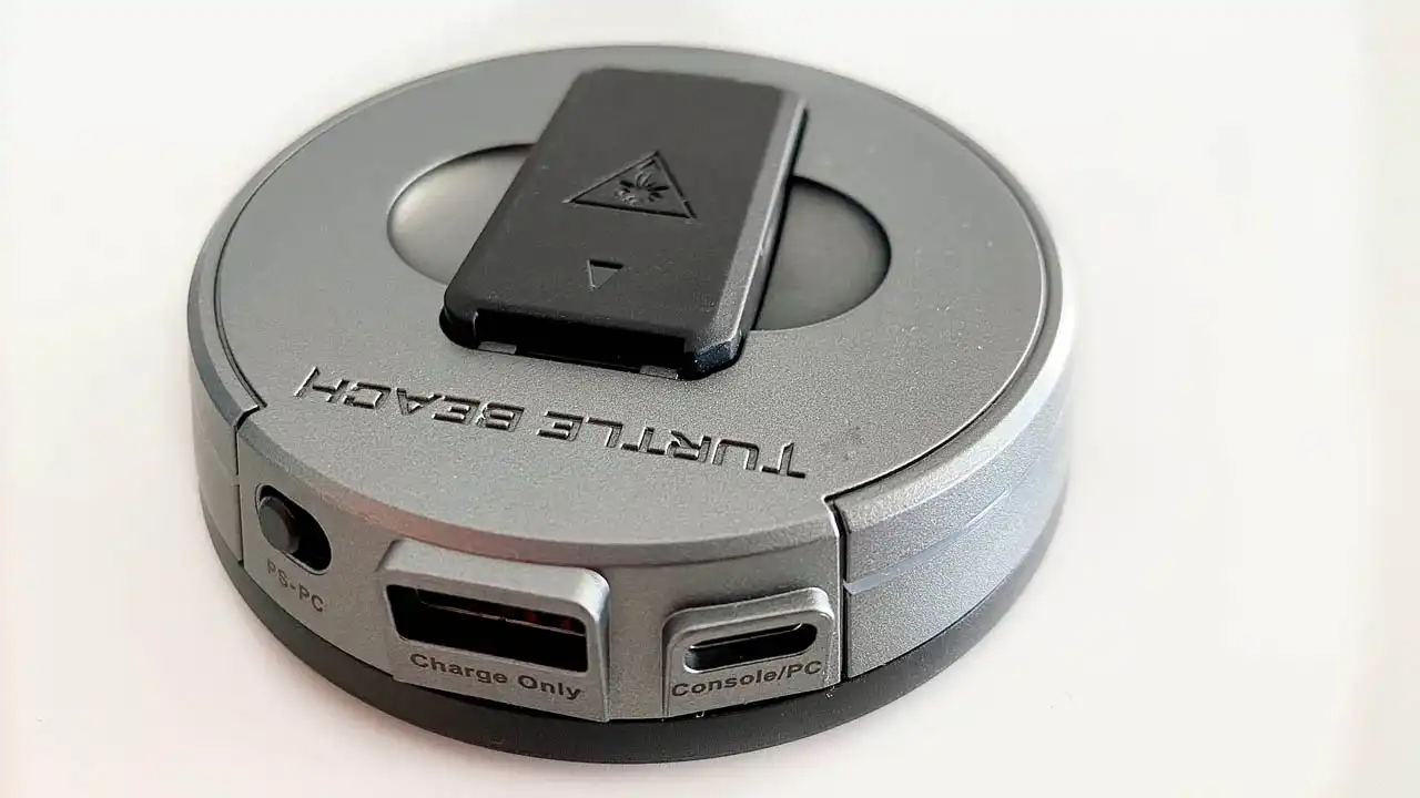 Le casque dispose d’un dongle USB assez imposant et d’un gris clair étrange, presque dérangeant puisqu’il ne matche pas avec l’esthétique du Stealth Pro, mais qui dispose en son centre d’une station d’accueil pour une seconde batterie. L’autonomie du casque n’est pas énorme puisqu’il offre environ 10 à 15 heures d’écoute selon l’activation ou non de la suppression de bruit active. Ce n’est d’ailleurs pas un argument mis en avant sur son packaging. Mais ce système de batterie interchangeable est une première chez Turtle Beach et le joueur peut ainsi repartir avec un casque chargé à bloc tandis que la seconde batterie recharge sur le socle / dongle USB relié au PC ou à la console. C’est très pratique, surtout que ce changement se fait très facilement sur l’oreillette de droite à l’aide d’un cache aimanté.
