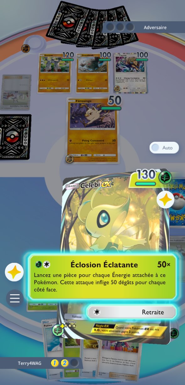 On peut ainsi imaginer qu’un Célebi Ex avec deux énergies attachées à lui équivaudra à 4 lancers. Les chances de mettre à terre la créature adverse est donc fort probable. l’issue du combat est ainsi très rapide.