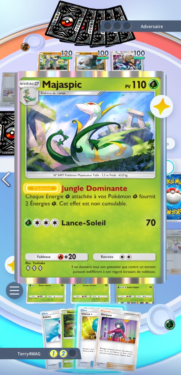 La particularité de ce Pokémon n’est pas forcément d’infliger 50 dégâts pour chaque face obtenue en lançant la pièce de jeu, mais plutôt d’obtenir un lancé pour chaque énergie accrochée à lui. Cette technique est déjà très forte, mais son effet peut être décuplé à l’aide du pouvoir passif de Majaspic. A l’instar de Gardevoir dans le deck Mewtwo, Majaspic multipliera par deux la compétence de Célebi Ex et boostera tous vos Pokémon plante: « Chaque énergie plante attachée à vos Pokémon plante fournit deux énergies plante.«