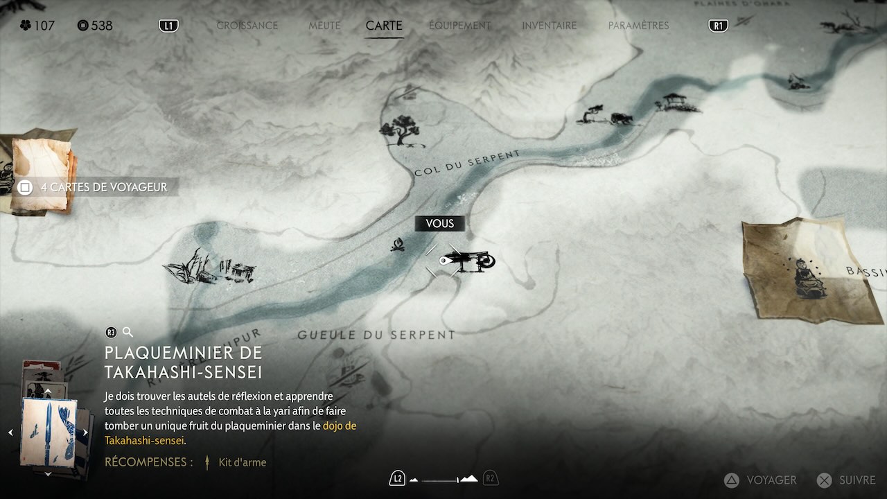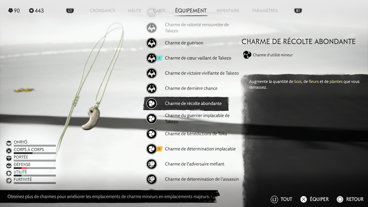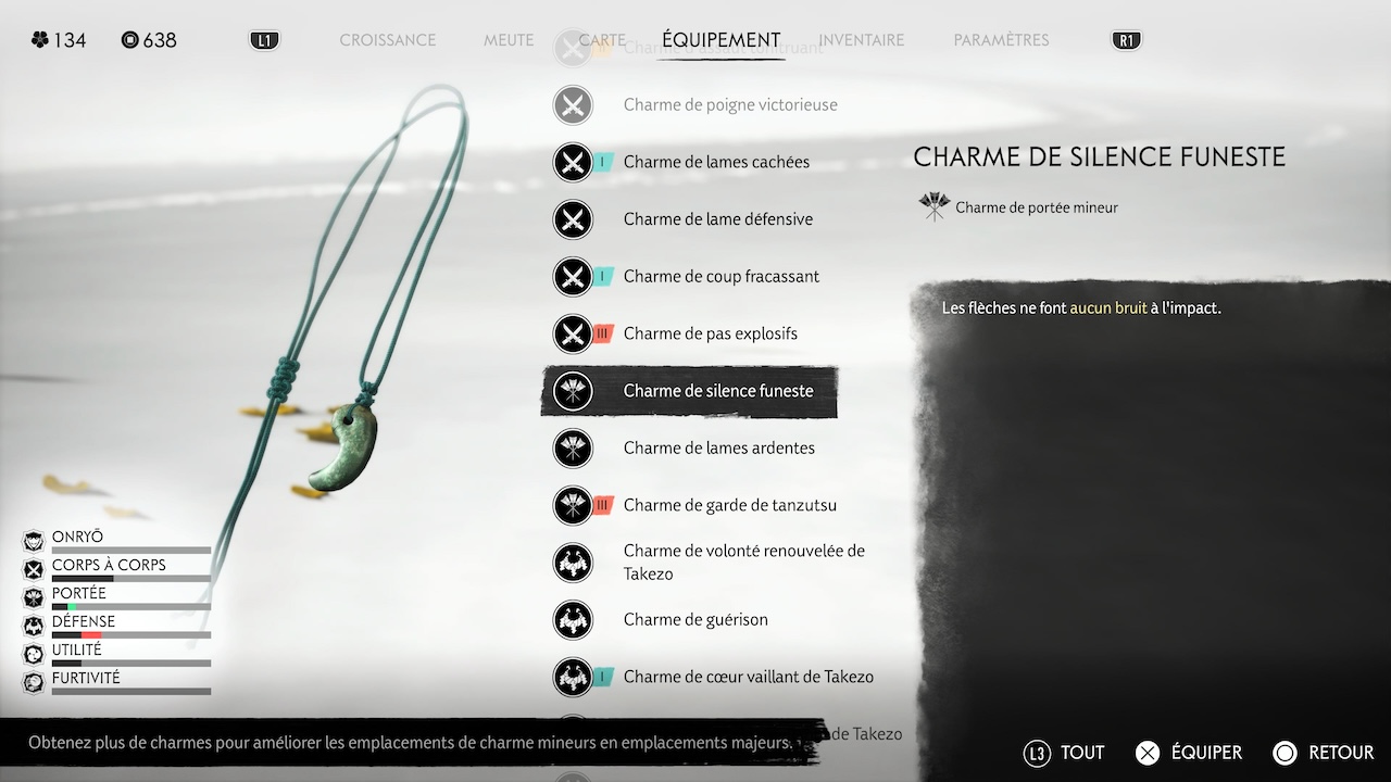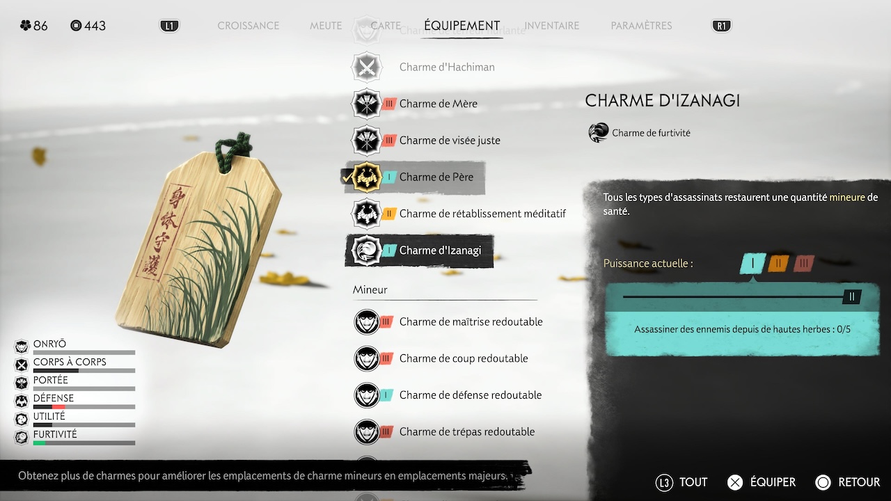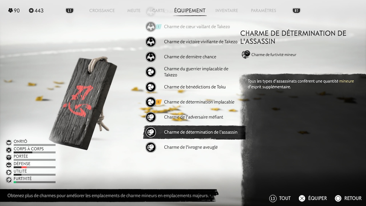 Autre choix pertinent, le charme de détermination de l’assassin se débloque dans une tanière de renards située près des Chutes de la tranquillité, à l’ouest des Prairies de Yotei. Il génère un peu d’esprit à chaque élimination discrète, une ressource précieuse à réinvestir dans les compétences d’armes ou dans les soins.