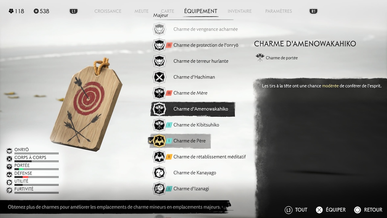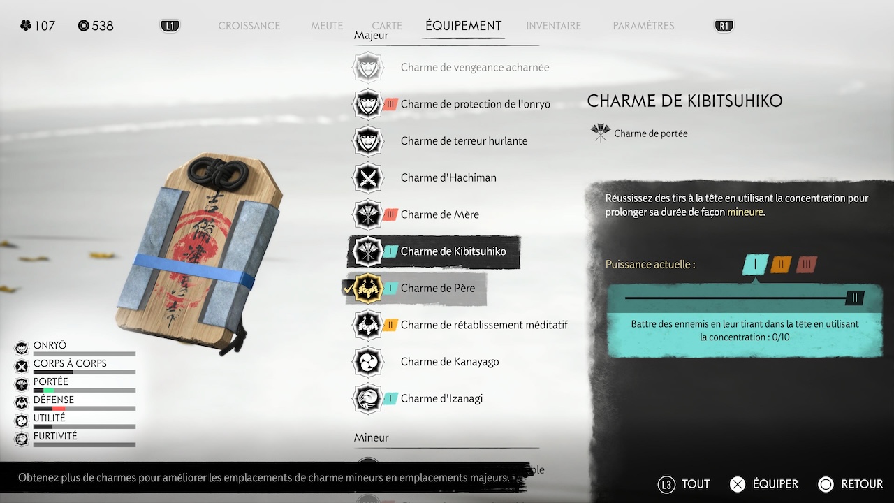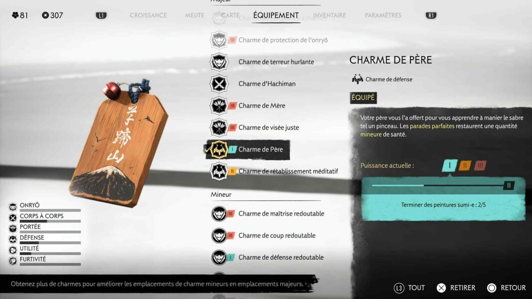 Chaque charme peut évoluer en puissance selon les actions accomplies : les bains aux sources chaudes augmentent l’efficacité des charmes de soins, les peintures Sumi-e renforcent certains effets liés aux parades, tandis que les chansons jouées au Shamisen améliorent ceux liés aux arcs. Accumuler ces talismans constitue un avantage stratégique, car leurs effets se cumulent et permettent de transformer des charmes mineurs en versions majeures.