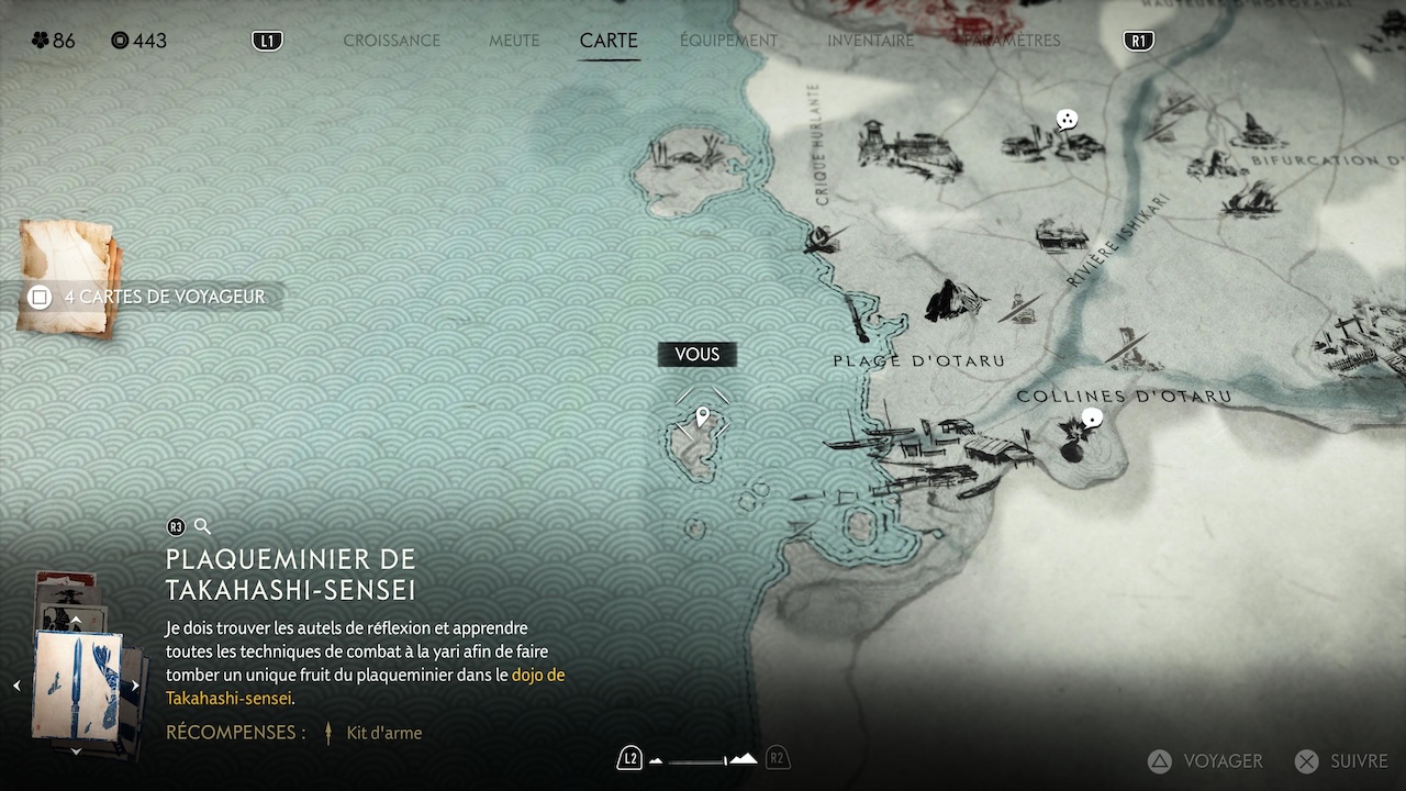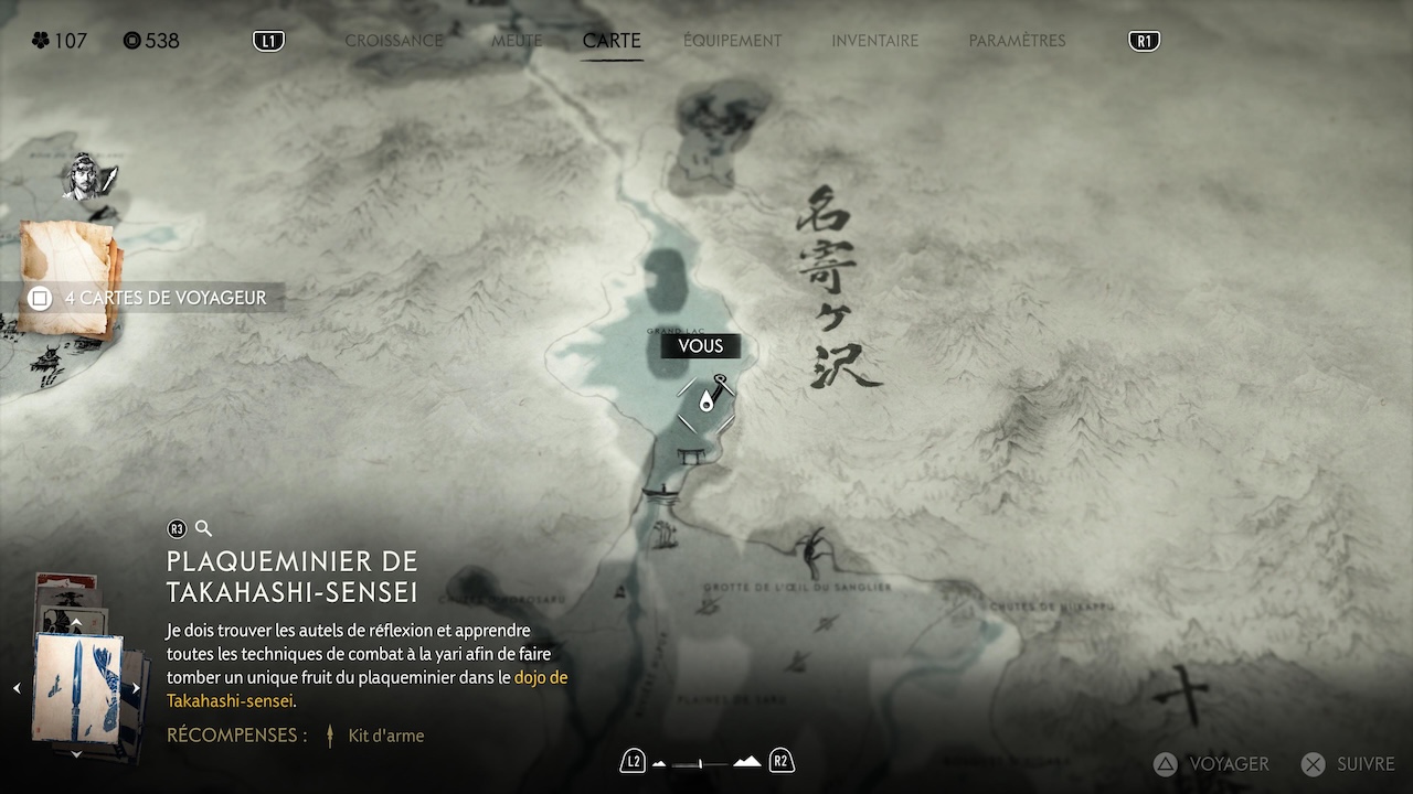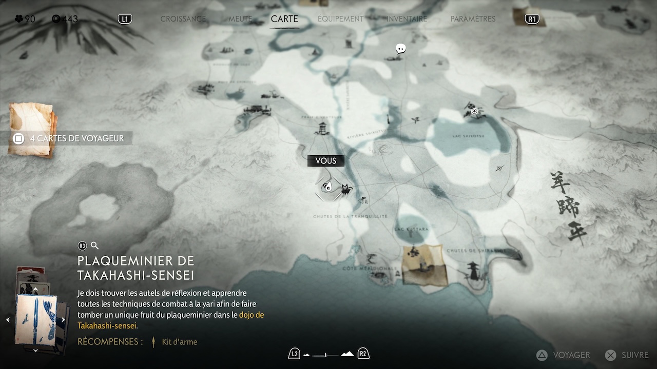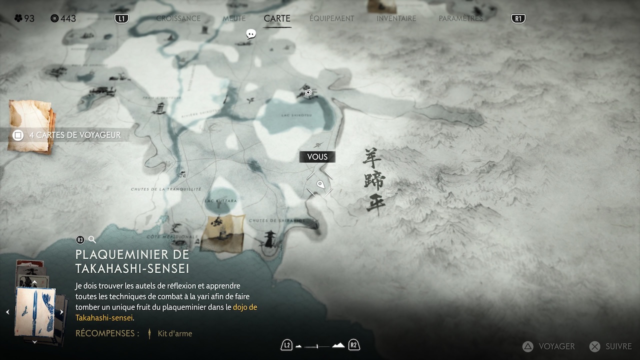 Dès vos premières heures dans les plaines de Yotei, certains charmes se révèlent incontournables. Le charme du Mont Yotei réduit les dégâts subis et se débloque après avoir résolu l’un des puzzles de reliquaire du jeu, l’un d’eux se trouvant au centre des Prairies de Yotei. Pour résoudre ces puzzles, il suffit de lire l’inscription sur la grosse pierre au centre et en déduire le positionnement des pierres l’encerclant. Résoudre d’autres de ces puzzles permettra d’augmenter le niveau de ce charme.