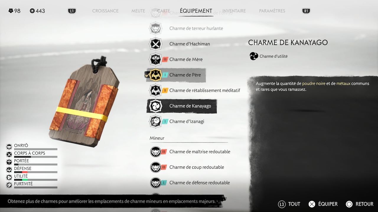 Un second talisman, le charme de Kanayago, agit de façon similaire sur les métaux et la poudre noire. Son emplacement est au sommet du Sanctuaire du Repos Automnal, à l’est du Lac Kuttara dans les Prairies de Yotei. Il est accessible en début de partie, ce qui vous remplira les poches tout au long du jeu.