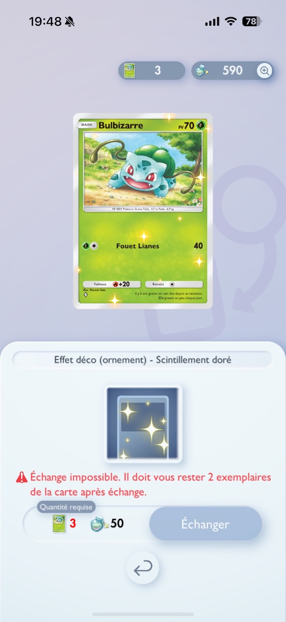 Économisez donc votre Poudre éclat pour les cartes rares ou stratégiques, qui bénéficieront vraiment d’un bonus de décos en combat. Cela vous permettra de tirer le meilleur parti de vos ressources.