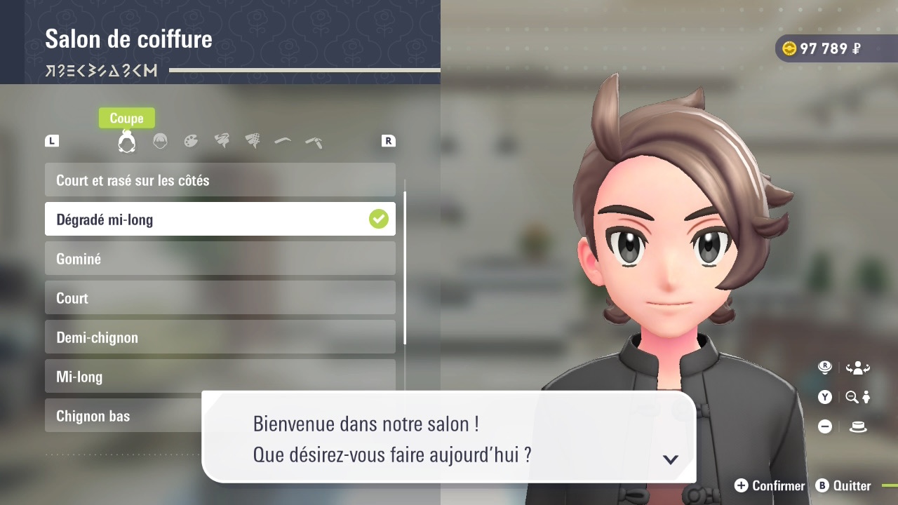 Avant même d’entrer dans le vif du sujet, Légendes Pokémon Z-A demande de choisir une langue — un choix définitif qui ne pourra plus être modifié ensuite. Cette décision est aussitôt suivie par la création du personnage. Le jeu permet une personnalisation assez profonde, débloquée après quelques heures, une fois le salon de coiffure accessible. Toutes les coiffures et vêtements sont disponibles quel que soit le genre sélectionné. Cependant, le modèle de corps choisi reste figé : les tailles, morphologies et tenues n’affichent pas toujours les mêmes rendus.