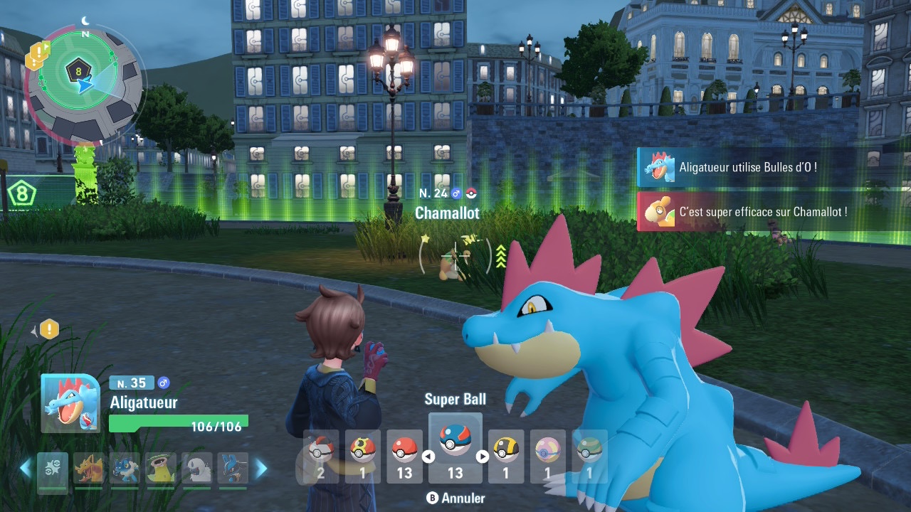 À cela s’ajoute une exploration plus organique d’Illumis. Plusieurs obstacles parsèment la ville : des rochers à briser avec des attaques de type Combat, des ronces à brûler avec du Feu, des toxines à nettoyer avec de l’Eau, ou encore des toiles d’araignées qu’il faut cibler avec des Pokémon volants. Plus loin dans le jeu, des cristaux méga pourront être détruits pour récupérer des fragments, échangeables contre des méga-gemmes. Chaque action environnementale rapporte un peu d’expérience au Pokémon utilisé, un moyen idéal de renforcer les recrues plus faibles.