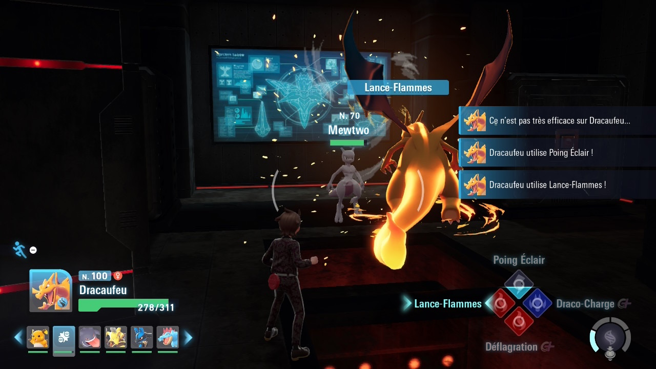 Une fois face au Pokémon 232, le combat s’engage rapidement. Mewtwo, au niveau 70, reste vulnérable face aux types spectre, ténèbres ou encore insecte, ce qui permet de le neutraliser facilement si l’on dispose d’une équipe bien préparée avec, par exemple, un Empiflor ou un Ectoplasma. Nous n’avons pas eu beaucoup de mal à l’affaiblir avec un pokémon de niveau 100.