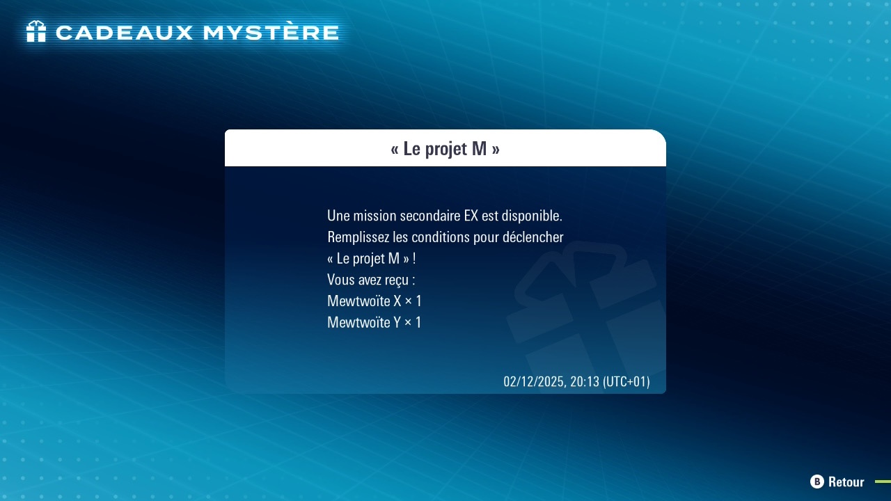 Une fois ces objets obtenus, aucun marqueur ne s’affiche dans la ville d’Illumis. Il est donc nécessaire de se téléporter au Café Lysandre et d’emprunter l’ascenseur jusqu’au sdernier sous-sol (au niveau -3). Là, une cinématique se déclenche automatiquement, marquant le début de la mission secondaire EX2 et l’apparition de Mewtwo dans la zone.