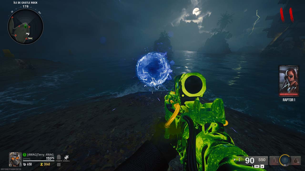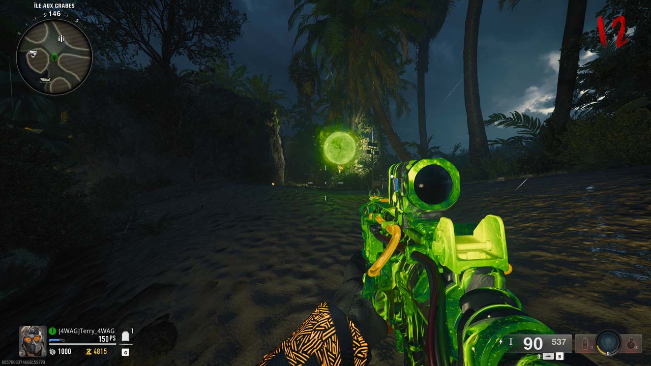 Interagissez avec l’orbe bleu en plaçant le Résonateur Multiphase en dessous. Une vague d’ennemis apparaît, et l’orbe tire un rayon sur un zombie, lui conférant une aura de la même couleur. Tuez ce zombie pour qu’il laisse tomber un petit orbe au sol. Ramassez-le et placez-le sur le gros orbe. Répétez cette action jusqu’à ce que l’orbe se déplace vers une nouvelle île; devient vert, se déplace à nouveau, puis devient mauve. Vous l’aurez compris, il faudra donc recommencer l’étape 3 fois.