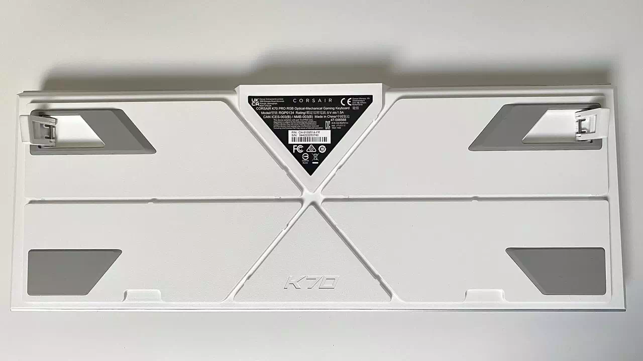 Tout comme son prédécesseur, ce modèle de clavier dispose d’une qualité de fabrication excellente. On retrouve encore le châssis en aluminium brossé noir pour une bonne impression de solidité. Sous les frappes des doigts, le K70 RGB Pro ne plie pas et reste parfaitement en place.Sur le dessous, le clavier comprend un passe-câble en étoile pour un ajustement précis ainsi que des petites pattes sur deux niveaux pour régler l’inclinaison du clavier sur le bureau.