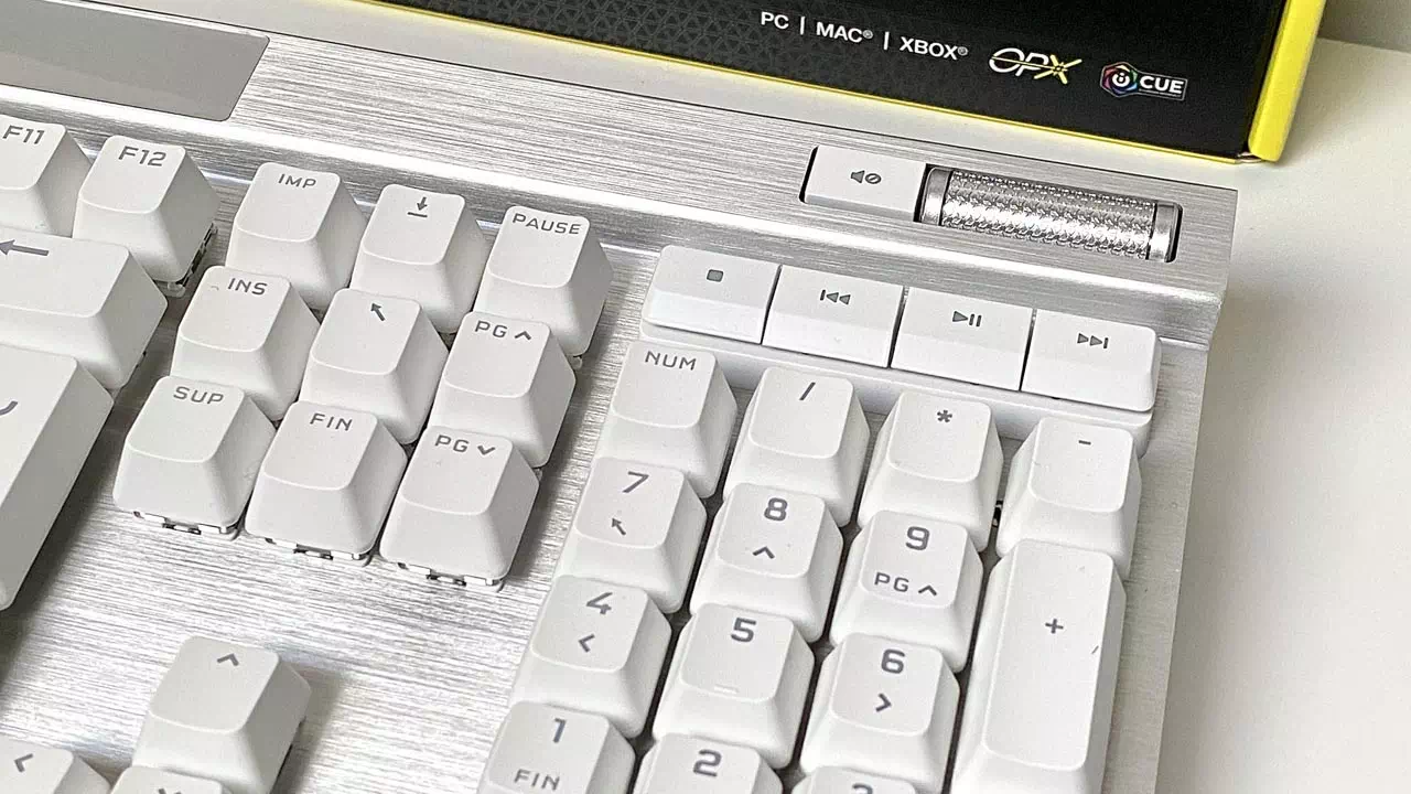 Le clavier dispose d’un pavé tactile, de touches médias dédiées sur le bord supérieur droit et la possibilité de régler l’éclairage, change de profil et verrouiller les touches Windows sur le bord supérieur gauche. Le tout est bien évidemment éclairé de la plus belle des manières. Un élément esthétique entièrement personnalisable avec diverses animations et des milliers de couleurs par le logiciel iCUE du fabricant (MacOS et Windows).