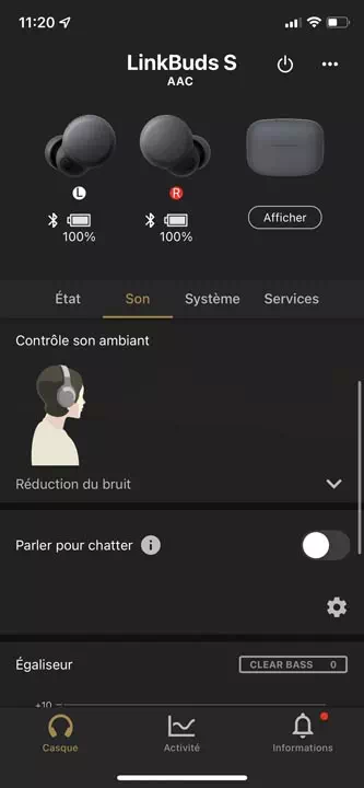 Avec l’application Sony Headphones, nous avons la possibilité de régler certains paramètres comme l’activation de la suppression de bruit intelligente (très efficace ceci dit), l’égalisation prédéfinie ou personnalisée ainsi que les fonctionnalités des surfaces tactiles gauche et droite. En somme, les possibilités sont équivalentes à tous les récents modèles de casques ou écouteurs du fabricant.