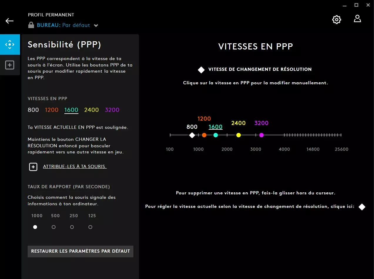 Chaque constructeur qui se respecte dispose de son application dédiée. Dans le cas de Logitech, le G Hub est l’endroit où il est possible de changer l’attribution de chaque touche de la souris, d’enregistrer jusqu’à 5 profils et régler la sensibilité du capteur sur plusieurs paliers.