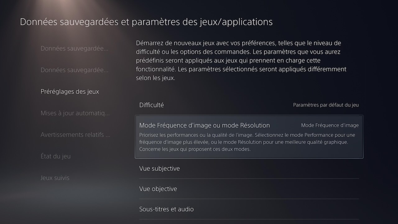 - Accédez à Préréglages des jeux