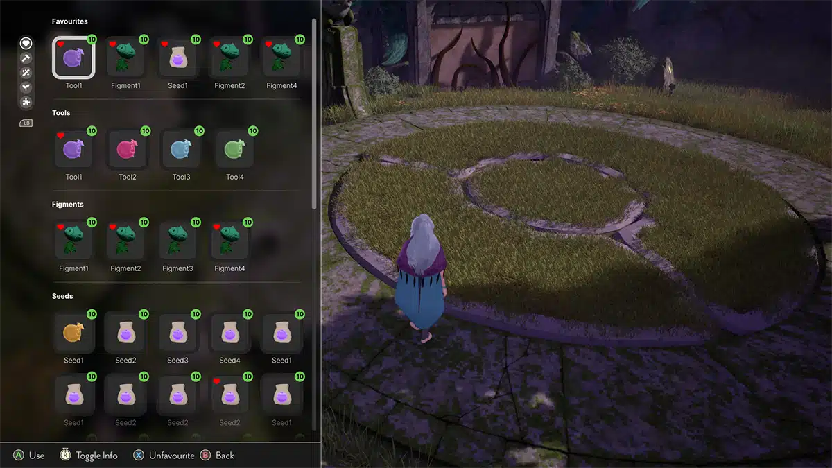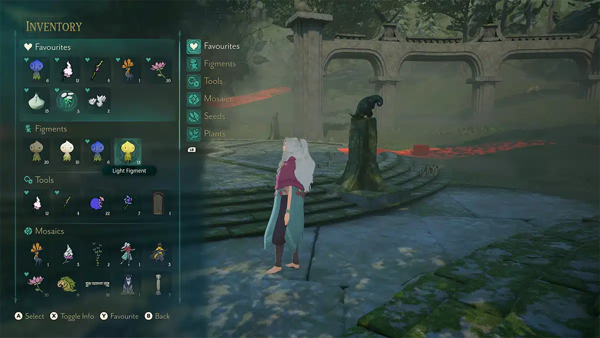 L’écran d’inventaire dévoile une organisation en six onglets : Favourites, Figments, Tools, Mosaics, Seeds et Plants. Outre les outils classiques et la barre d’accès rapide, certains onglets laissent entrevoir des systèmes de jeu inédits. Le menu Figments met en avant de petites créatures colorées, dont une identifiée comme “Light Figment” – signe probable d’un système de collecte ou d’utilisation d’entités mystiques. Quant à l’onglet Mosaics, il semble lié à un aspect décoratif, avec des motifs représentant des personnages et animaux déjà aperçus dans les vidéos promotionnelles.