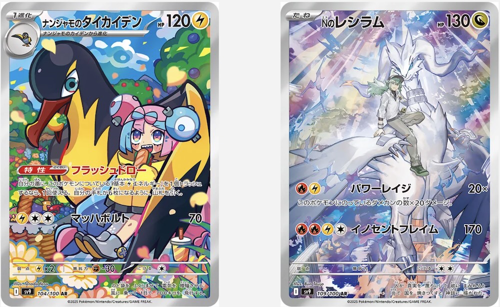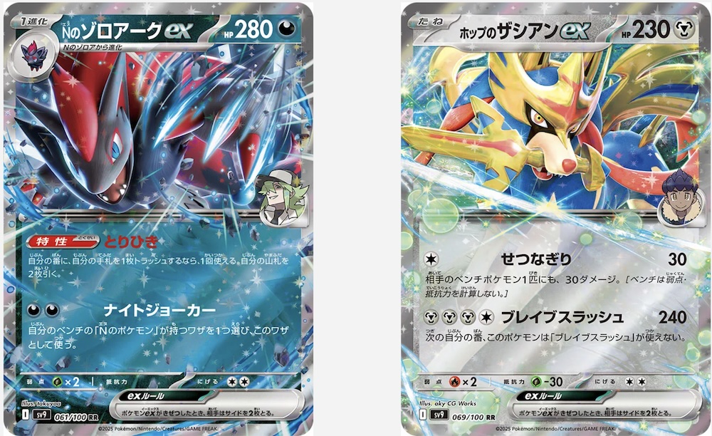 Les cartes de Pokémon de Dresseurs et Dresseuses mettent en avant des liens uniques entre un Pokémon et son Dresseur. Chaque carte porte le nom du Dresseur et propose une illustration exclusive, accessible en différents niveaux de rareté, allant de rare à hyper rare. Parmi les duos mis à l’honneur, on retrouvera notamment Zoroark-ex et N, Mélofée-ex et Lilie, ainsi qu’Ampibidou-ex accompagné de Mashynn.