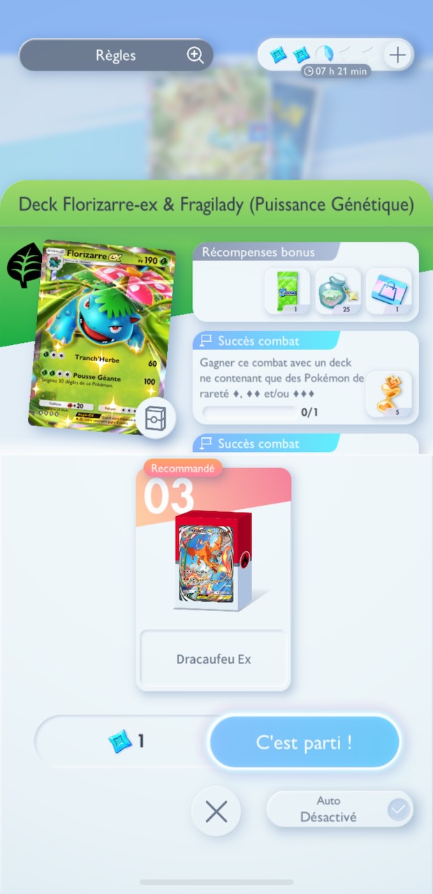 Les premiers affrontements sont assez simples, mais la difficulté augmente rapidement, demandant des stratégies plus élaborées et des decks bien construits. Si vous n’avez pas un deck optimisé, lesDecks de Location peuvent vous donner un coup de pouce. Autrement, si vous en avez la possibilité, le deck Dracaufeu Ex est évidemment un must-have.