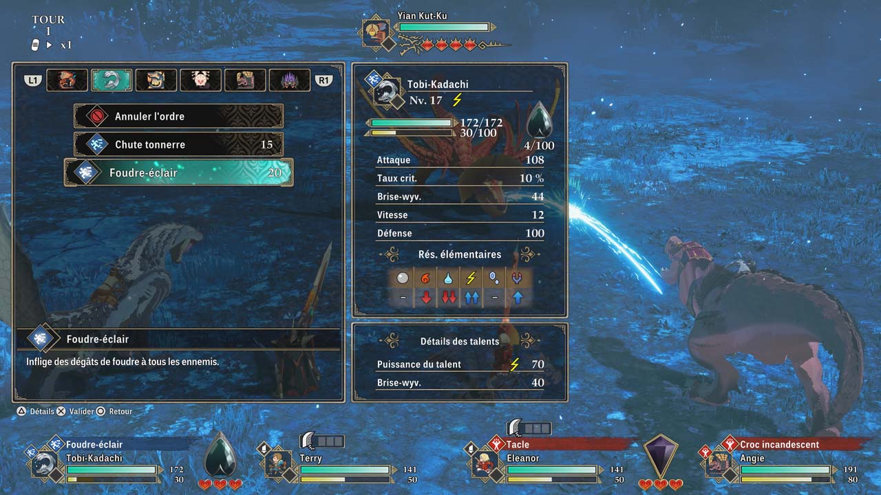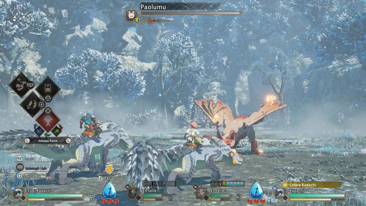Le cœur du gameplay repose sur un système au tour par tour toujours basé sur le trio puissance / vitesse / technique, mais la formule gagne en complexité. Les affrontements intègrent désormais une logique plus fine, où le choix de l’arme et du type d’attaque influe directement sur l’issue d’un tour. Une mauvaise décision peut entraîner un contre immédiat de l’ennemi, ce qui pousse à observer les comportements et à anticiper les actions des monstres.