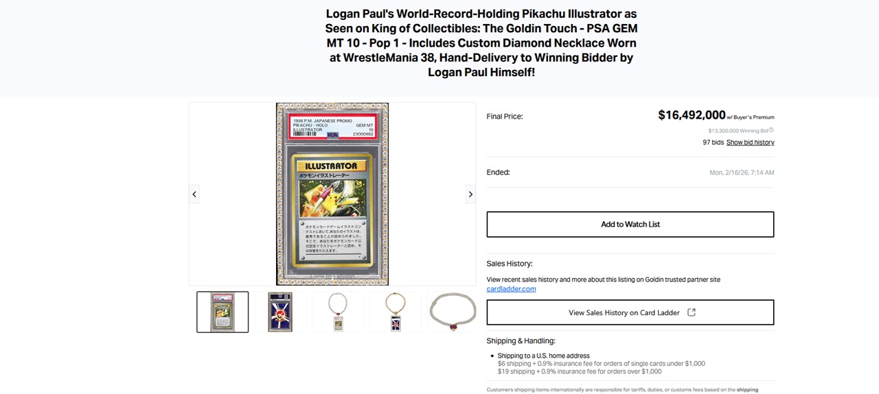 Logan Paul avait acquis cette carte en 2021 pour 5,275 millions de dollars, un montant qui lui avait valu un record Guinness pour la carte Pokémon la plus chère jamais vendue à l’époque. L’exemplaire provenait d’un échange incluant une version notée PSA 9 et un complément financier. Depuis, la carte était devenue un objet d’exposition, Paul ayant investi environ 70 000 dollars dans un pendentif et un étui sur mesure, qu’il avait notamment portés lors de WrestleMania 38. L’ensemble — carte, boîtier et collier — faisait partie du lot proposé aux enchérisseurs.