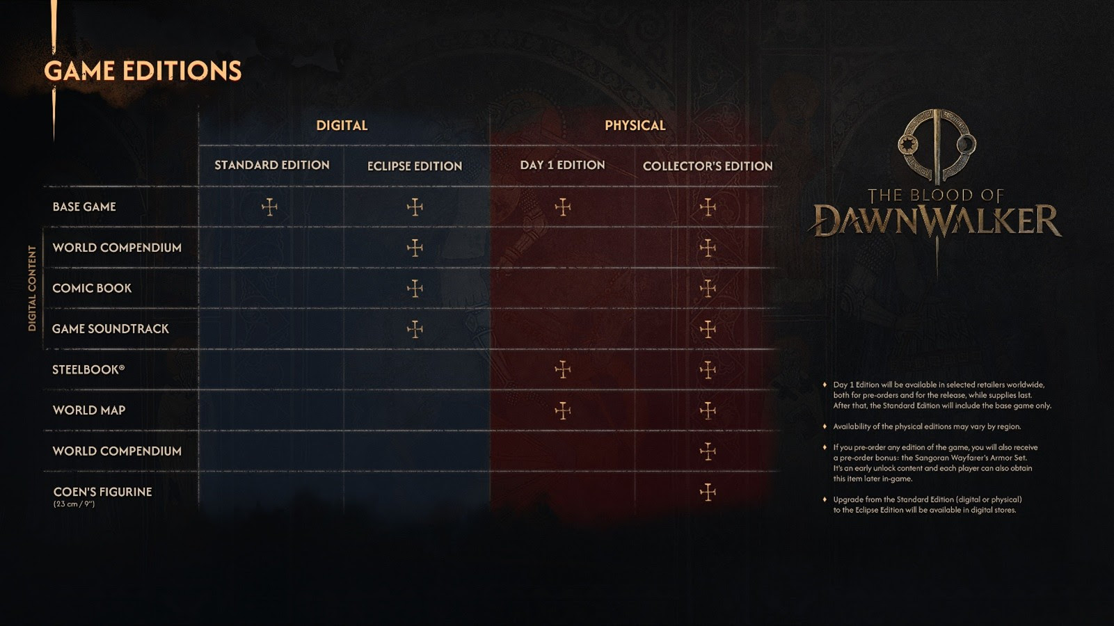 Côté éditions, The Blood of Dawnwalker sera disponible en édition numérique standard, en Day One Edition chez les revendeurs, mais aussi dans une Eclipse Edition. Cette dernière inclut plusieurs bonus numériques, dont un compendium de l’univers, la bande originale et une bande dessinée. Une édition Collector en quantité limitée a également été annoncée, sans que tous ses détails pratiques soient développés dans les textes fournis.