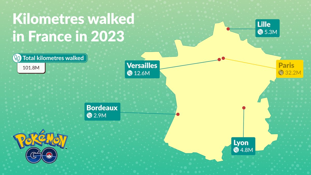 En France, les dresseurs ont parcouru un total impressionnant de 101,8 millions de kilomètres. Sa capitale, Paris, mène le podium avec 32,2 millions de kilomètres, suivie de Versailles avec 12,6 millions de kilomètres et de Lille avec 5,3 millions de kilomètres. Lyon et Bordeaux ferment la marche avec respectivement 4,8 millions et 2,9 millions de kilomètres.