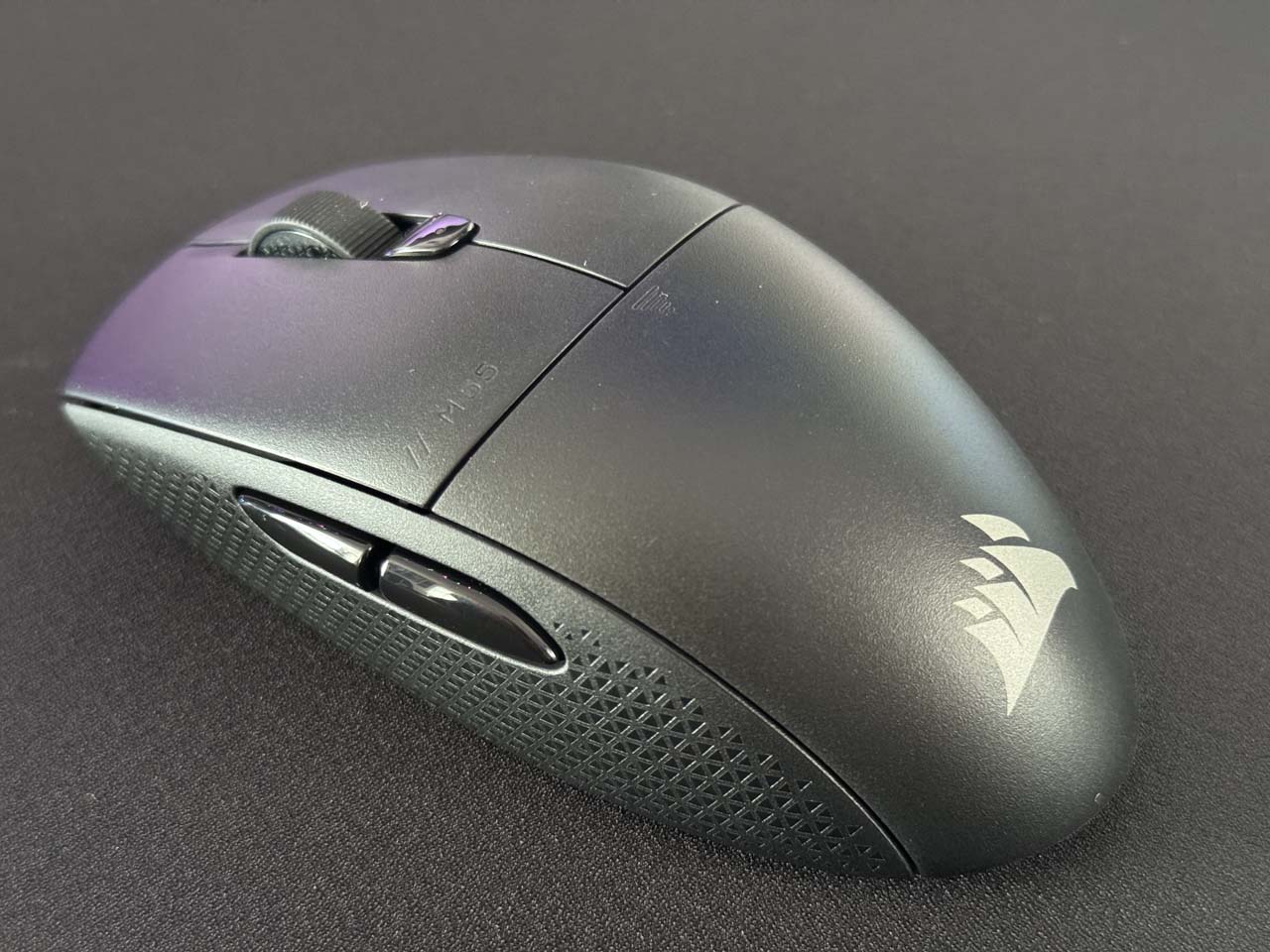 Côté finitions, Corsair fait bien les choses. Le revêtement texturé sur les côtés permet une bonne adhérence, même en pleine action. On sent que la solidité est là. Mais le souci majeur de cette souris réside dans son équilibrage. La batterie à l’arrière crée un déséquilibre qui peut freiner vos mouvements, surtout si vous jouez à des jeux nécessitant des réflexes rapides.