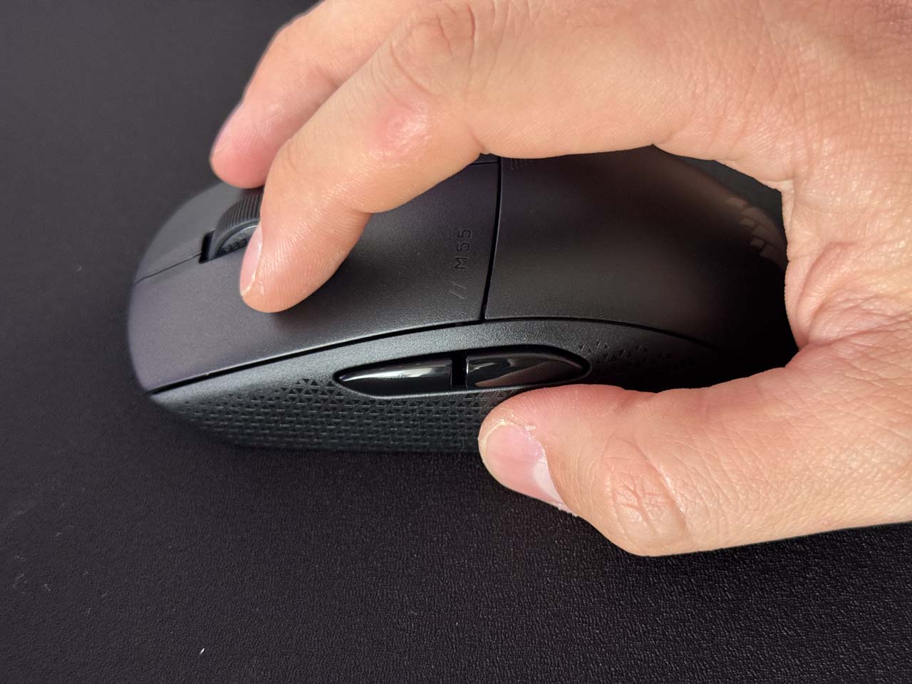 Quand il s’agit de souris gaming, l’ergonomie est un des points primordiaux. Peu importe la technologie embarquée, si la prise en main n’est pas au rendez-vous, votre expérience en jeu en souffrira. Le format de la Corsair M55 Wireless la destine à ceux qui utilisent principalement une prise en main de type fingertip. Si vous êtes adepte de la palm grip (paume reposant sur la souris) ou de la claw grip (en griffe), vous pourriez vite ressentir un certain inconfort, surtout pendant des sessions prolongées.