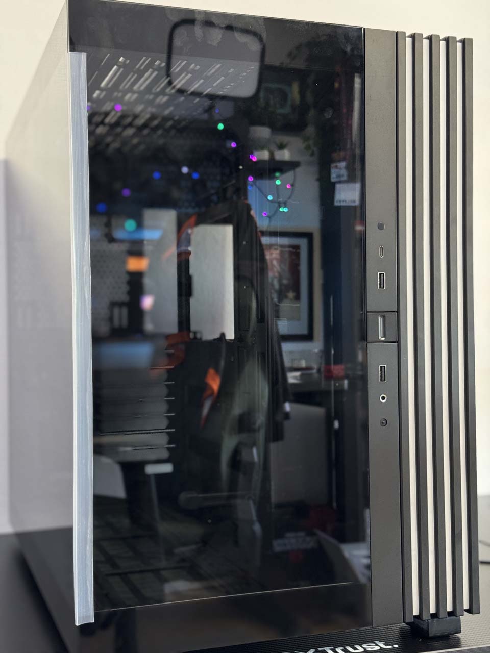 La connectique frontale se concentre sur l’essentiel avec deux ports USB 3.0, un USB-C et une prise jack combinée pour casque-micro. Tout est centré sur une bande transversale, garantissant une symétrie visuelle quel que soit l’angle choisi pour positionner le boîtier.