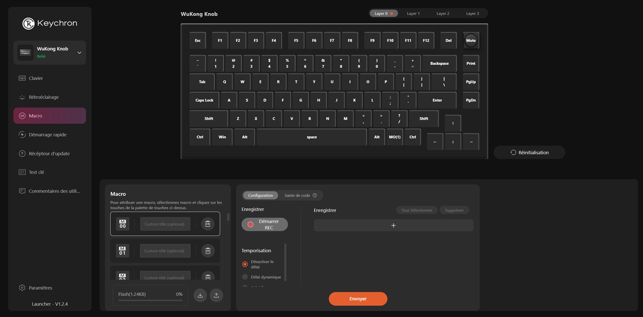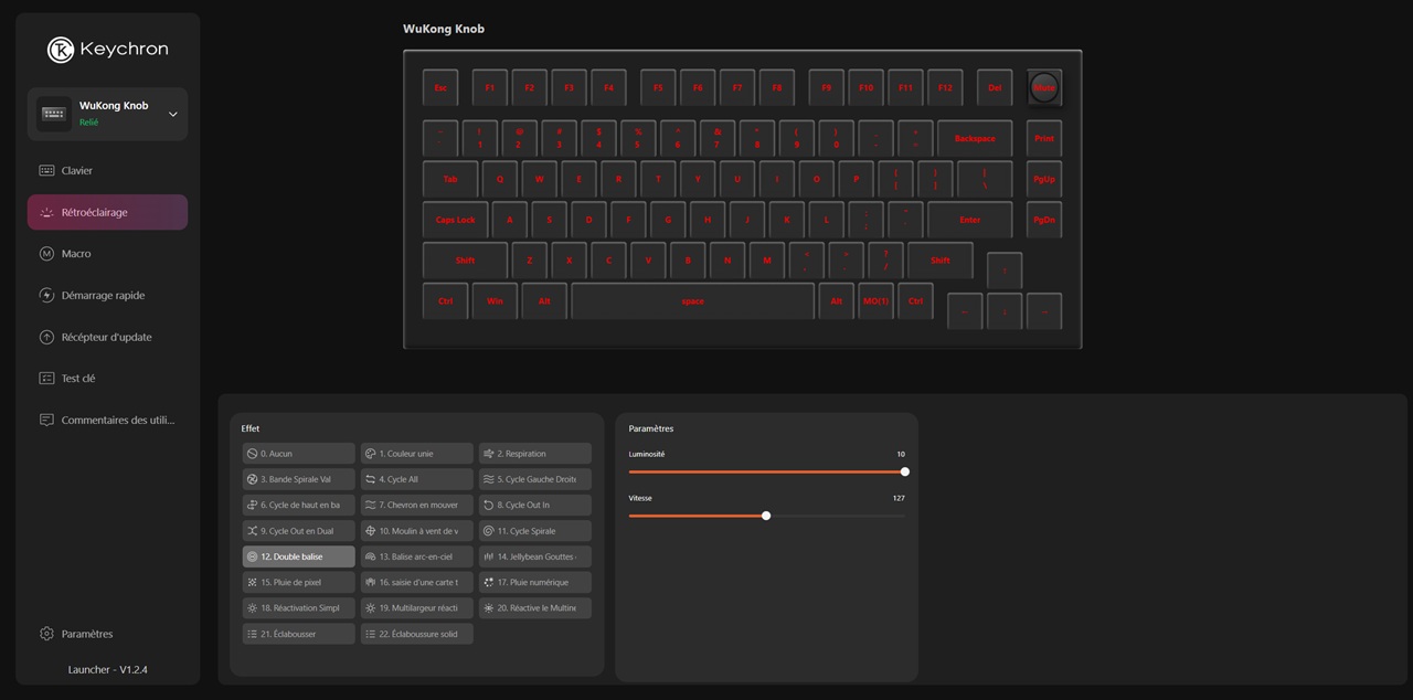 L’éclairage RGB embarqué offre 22 effets lumineux prédéfinis, modifiables directement via des raccourcis clavier. L’ensemble peut également être configuré depuis le Keychron Launcher, une application web dédiée permettant de reprogrammer les touches, créer des macros, et ajuster les animations lumineuses selon les préférences de l’utilisateur. Le clavier reste ainsi aussi fonctionnel que personnalisable, avec un positionnement clairement orienté performance et confort d’utilisation.