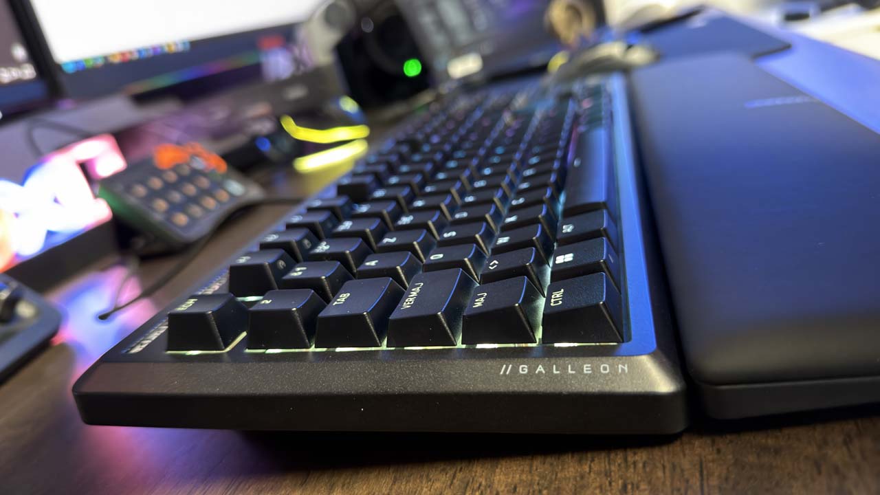 Le Galleon 100 SD adopte un format tenkeyless, soit sans pavé numérique, mais celui-ci est agrémenté de 12 touches Stream Deck disposées à droite du clavier principal. Accompagnées de deux molettes rotatives, elles permettent de lancer des applications, contrôler le volume ou encore naviguer dans des profils personnalisés sans passer par un logiciel tiers. Le bestiaux pèse tout de même plus de 1.3kg, et il prendra donc assez de place sur le bureau et restera compliqué à bouger. Un détail qui doit être pris en compte si l’on veut sauvegarder de l’espace sur le bureau ou bouger son clavier pour des sessions de jeu incisives.