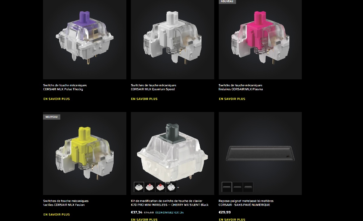 Au cœur du Galleon 100 SD, Corsair intègre ses switchs mécaniques linéaires MLX Pulse, pré-lubrifiés pour une frappe fluide et silencieuse. Avec une force d’activation de 45 grammes et un point d’activation à 2 mm, ces switchs nous ont offert une réactivité précise, aussi appréciable en jeu comme pour la dactylographie. Leur durée de vie est estimée à 80 millions de frappes, tandis que la compatibilité hotswap autorise l’échange avec d’autres switchs 3 ou 5 broches, Corsair proposant déjà une gamme solide sur son site officiel.