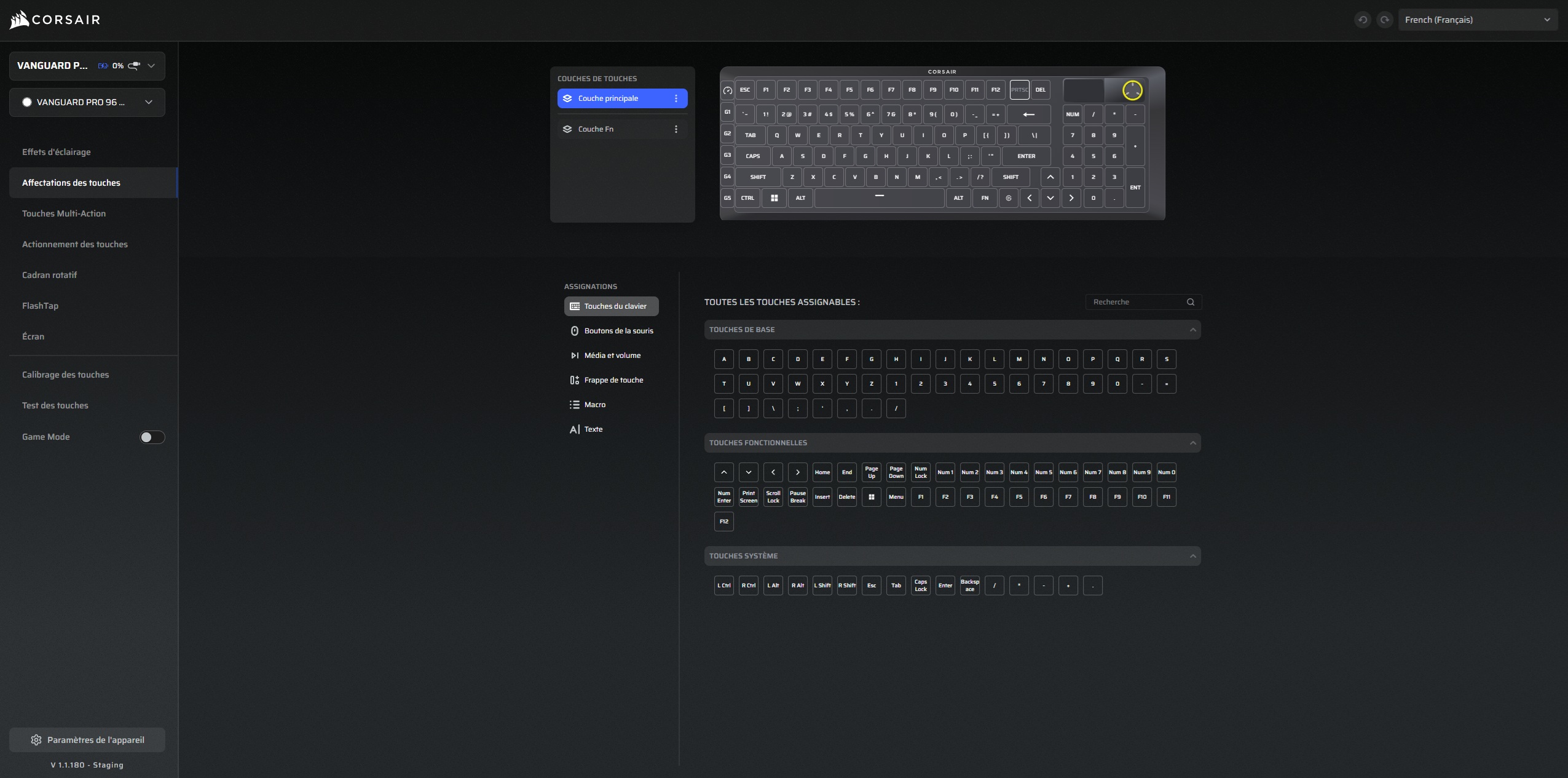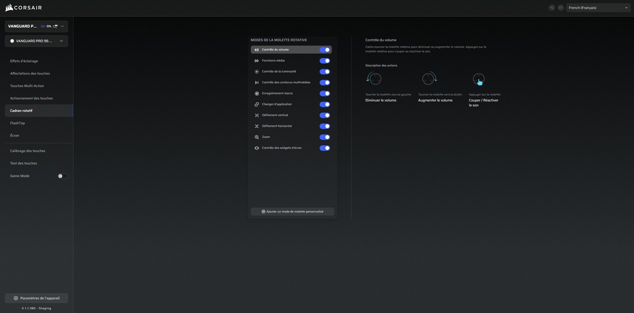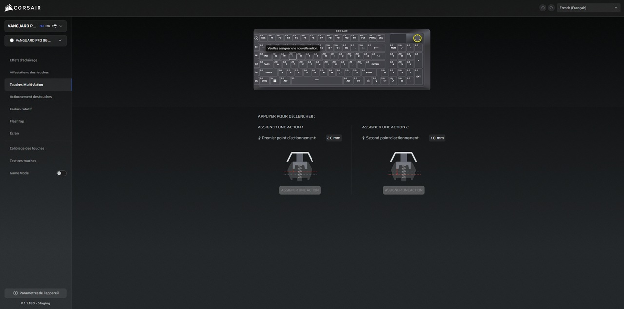 Une autre fonction essentielle est la compatibilité totale du Vanguard Pro 96 avec le Corsair Web Hub. De ce fait, les utilisateurs ne sont plus forcés de passer par le logiciel iCUE pour paramétrer et mettre à jour le clavier. Une seule interface (compatible avec certains navigateurs comme Google Chrome) offre la possibilité de réattribuer les touches du clavier, affecter des macros, le point d’activation des switches ou encore activer et régler le FlashTap. Cette fonction, présente depuis un moment sur les récents claviers corsair, permet enfin de prioriser l’une ou l’autre entrée lorsque l’utilisateur effectue des frappes rapides et successives entre différentes touches. Cela permet d’éviter de lancer une action tant qu’une autre n’a pas débuté ou inversement.