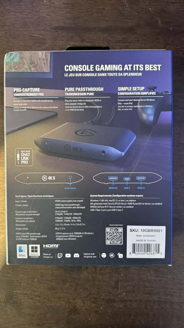 La configuration de ce nouveau petit boitier 4K S se veut accessible, même pour les utilisateurs novices. Il suffit de relier votre console à l’entrée HDMI in à l’aide du câble fourni, puis de connecter la sortie HDMI out à votre moniteur ou téléviseur. Le port USB-C, quant à lui, assure le lien entre la carte et votre ordinateur.