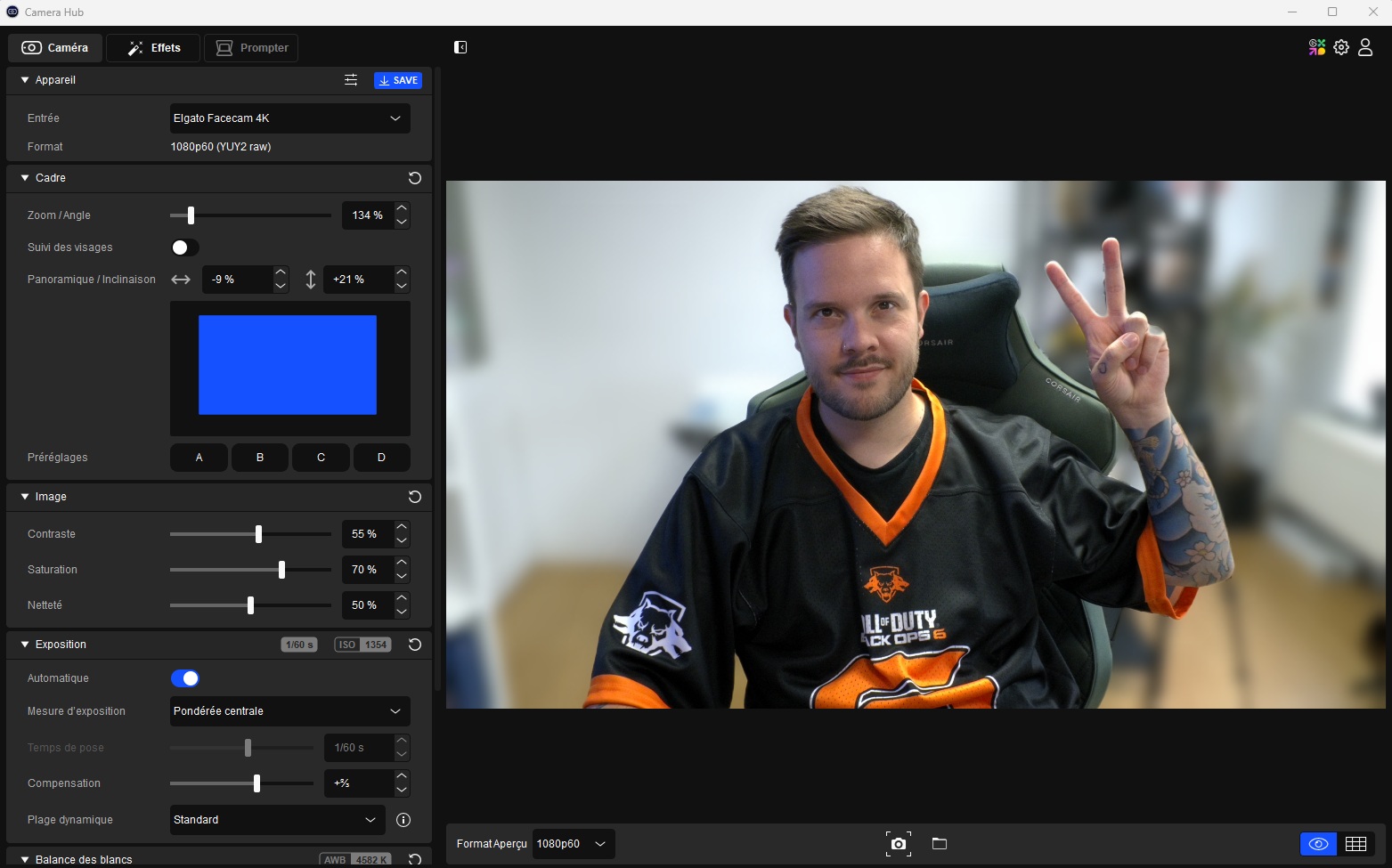 La Facecam 4K fonctionne de manière transparente avec le Camera Hub d’Elgato, un logiciel de gestion complet qui donne accès à des réglages fins et précis de l’exposition, de la balance des blancs, de la colorimétrie et de la netteté, ainsi qu’à l’ajout de LUTs pour personnaliser le rendu visuel selon les besoins. Les LUTs – comparables à des filtres colorimétriques professionnels – permettent de créer une image homogène sur un setup multi‑caméras, d’harmoniser le rendu entre différents appareils ou d’apporter une signature visuelle distinctive allant de corrections légères pour un rendu naturel à des effets plus marqués pour un style affirmé. Les profils ainsi configurés peuvent être enregistrés dans la mémoire interne de la webcam, garantissant leur disponibilité immédiate sur n’importe quelle machine sans nécessiter de nouvelle configuration.