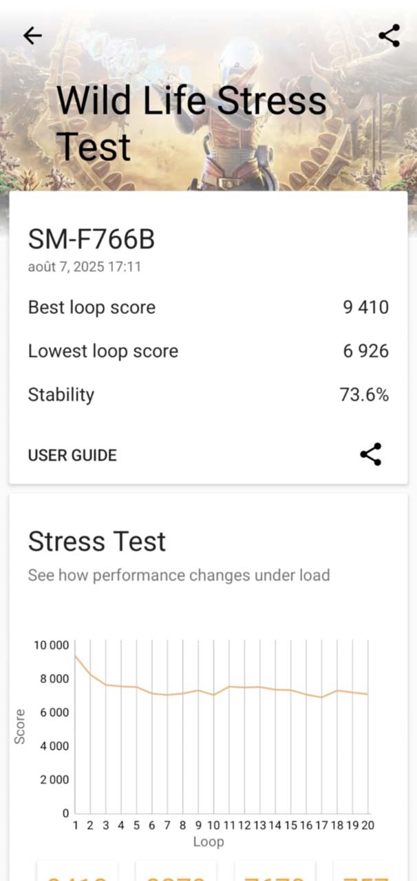 Le Galaxy Z Flip 7 embarque le processeur Exynos 2500, conçu pour répondre aux exigences actuelles en matière de performances mobiles. Ce choix stratégique de Samsung marque une continuité technique assumée, avec des résultats satisfaisants dans les usages du quotidien. L’interface reste fluide, les temps de chargement sont maîtrisés et les applications les plus lourdes, y compris les jeux 3D récents, tournent sans accroc.