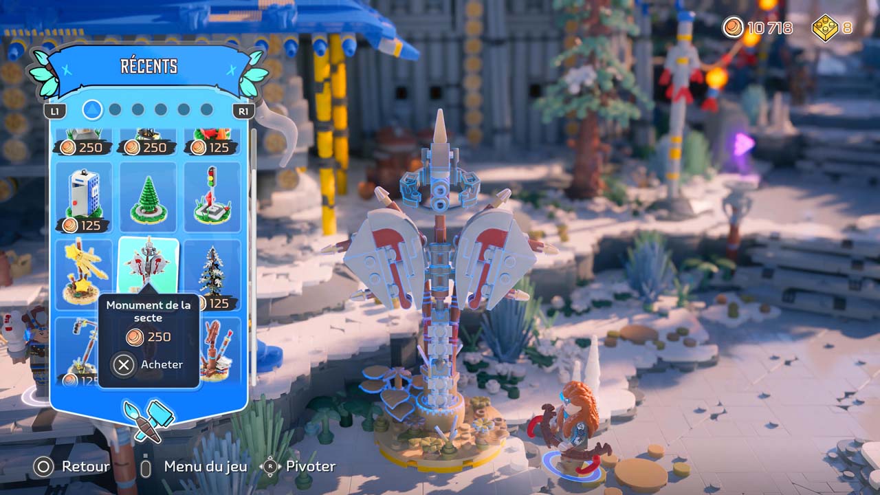 En effet, chaque niveau accompli se solde par l’obtention d’une fameuse brique dorée. En accumuler permettra de revenir au village d’Aloy pour y construire de nouveaux bâtiments, accueillir de nouveaux PNJ et fonctionnalités et même personnaliser ces bâtiments. C’est via un petit menu qu’on va pouvoir changer l’apparence des constructions, et même de l’environnement en optant, pourquoi pas, pour des variantes issues d’autres franchises comme Lego City ou Lego Ninjago.
