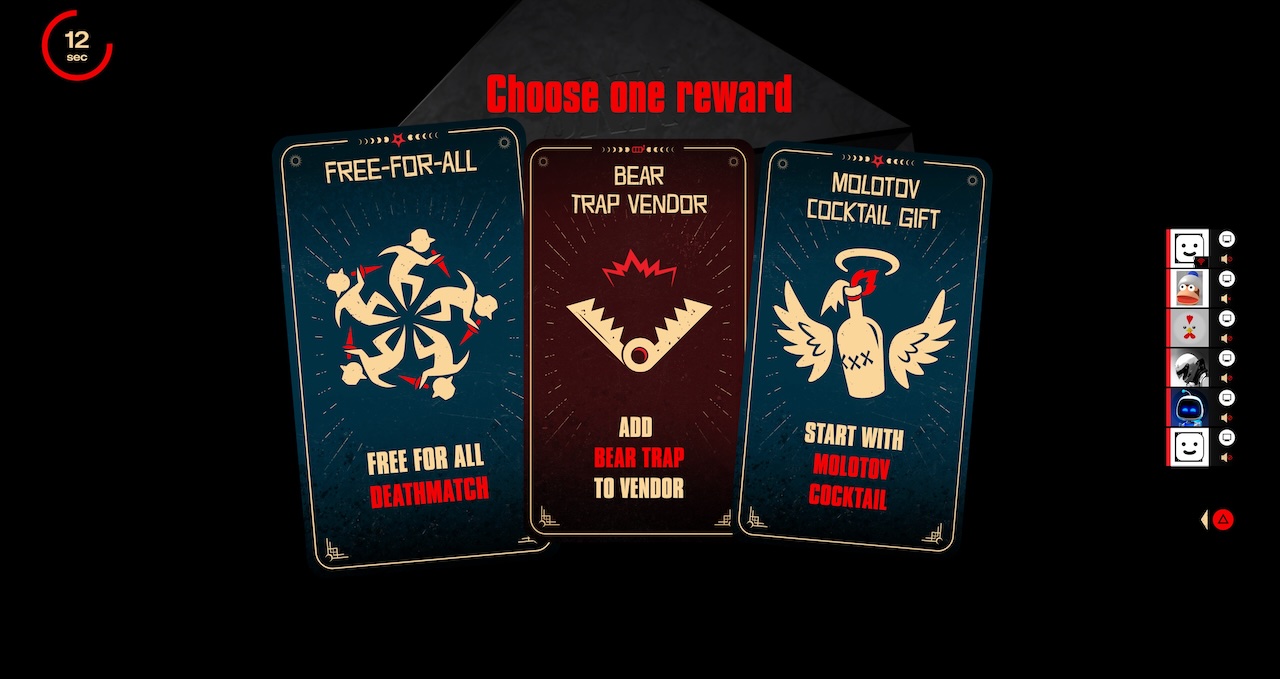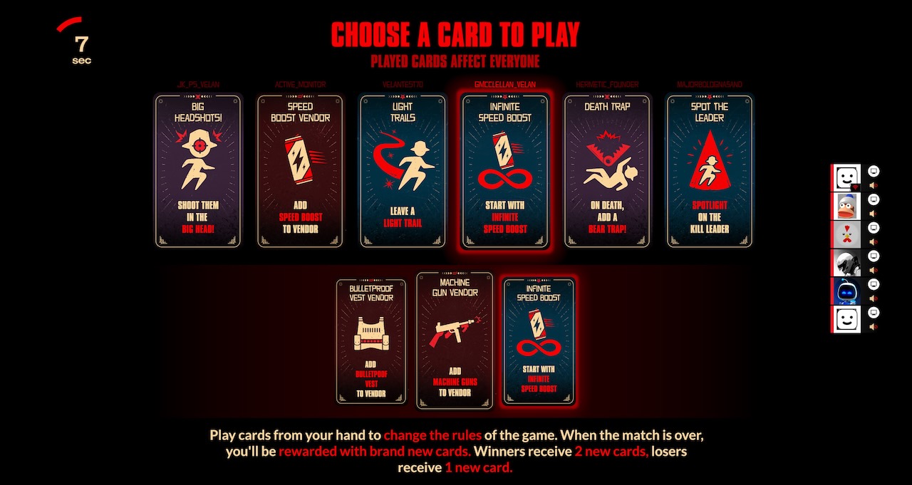 Le jeu intègre plusieurs modes classiques comme le free-for-all et le team deathmatch, mais mise surtout sur son mode Wild Card. Ce dernier injecte des règles aléatoires via des cartes événementielles tirées en début de partie : joueurs rétrécissant à chaque tir reçu, armes modifiées, traînées lumineuses suivant les kills… Ces variations apportent une dynamique originale mais complexifient aussi la lecture du jeu pour les débutants.