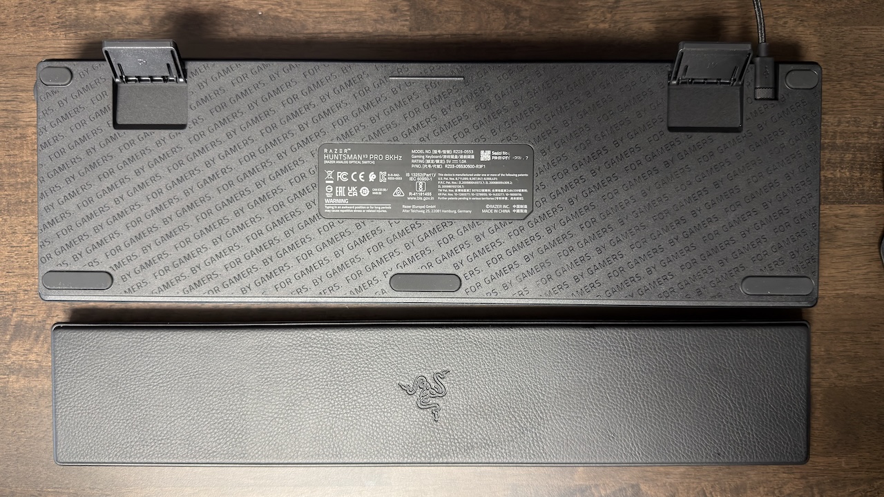 Côté connectique, Razer opte pour un port USB-C positionné à gauche du clavier, avec une encoche cette fois assez large pour accueillir des câbles de marques tierces. L’inclinaison par défaut est très confortable, suffisante pour se passer des pieds rétractables. L’ensemble dégage une sensation de compacité bien pensée, même sur la version full-size que nous testons. Le célèbre logo « For Gamers By Gamers » est discrètement gravé sous la coque, rappelant l’ADN de la marque sans verser dans l’ostentatoire.