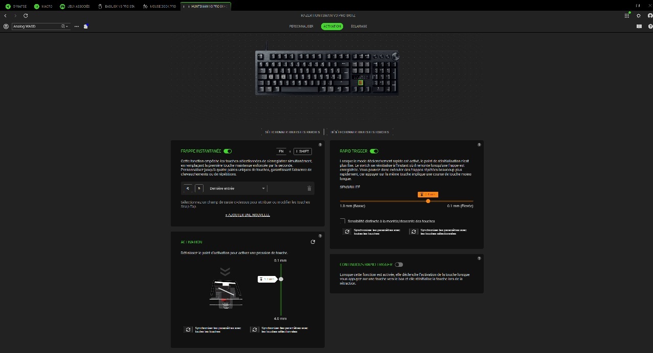 Parmi les options avancées, on retrouve le Snap Tap et le Rapid Trigger, deux fonctionnalités appréciées des joueurs de FPS. Si certains jeux bloquent encore leur usage, elles restent parfaitement activables dans la plupart des titres grand public.