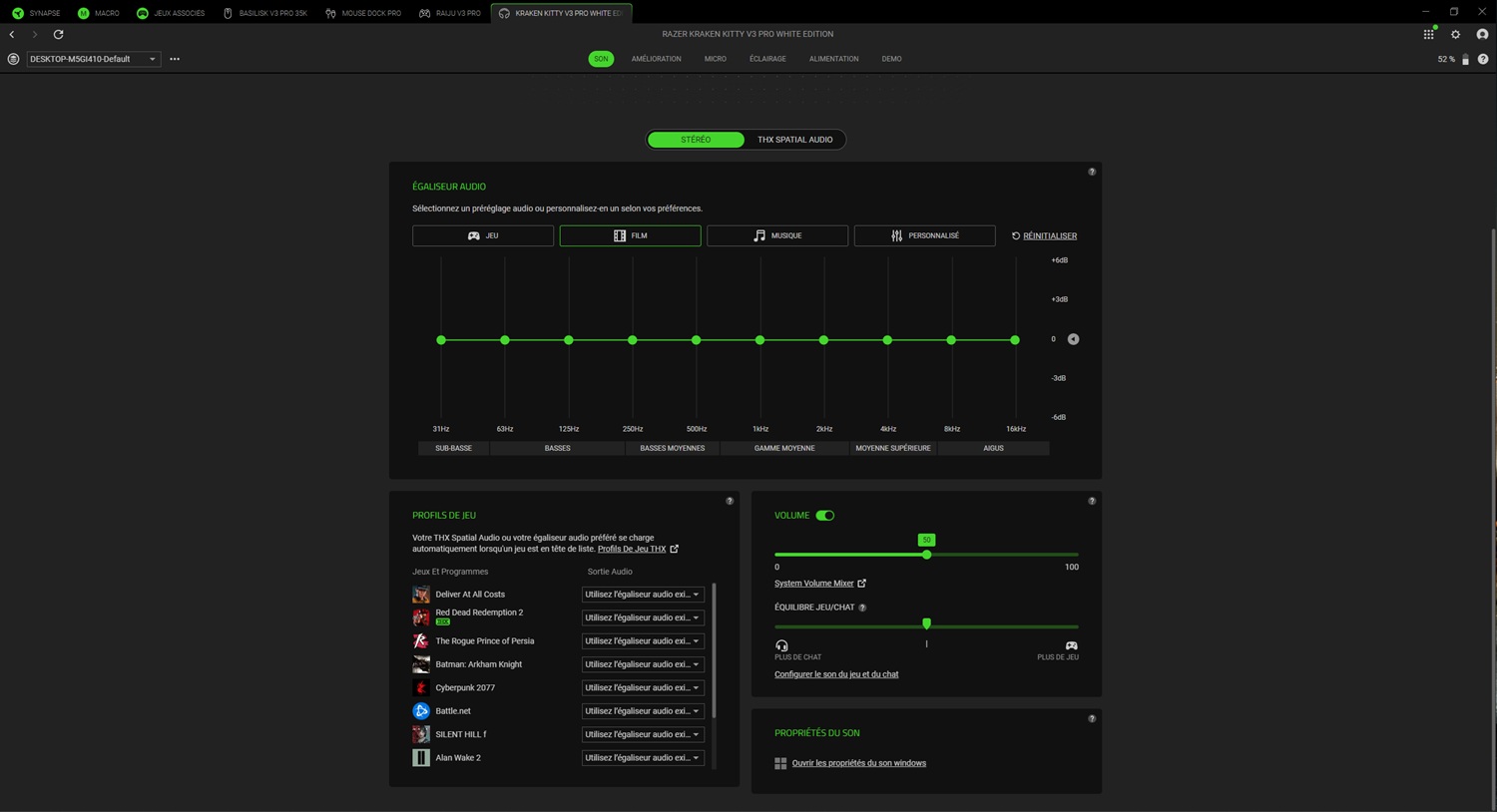 Sur le plan sonore, le Kraken Kitty V3 Pro livre une prestation étonnamment maîtrisée. Malgré l’abandon des haut-parleurs TriForce Titanium de 50 mm au profit de transducteurs de 40 mm, le casque conserve une restitution claire et immersive. En jeu, la compatibilité avec le THX Spatial Audio offre une spatialisation convaincante, notamment sur des jeux nerveux comme Black Ops 6 ou ARC Raiders, où chaque tir ou bruit de pas gagne en précision directionnelle. Ce rendu précis permet d’améliorer la perception de l’environnement, sans surcharge artificielle des basses.
