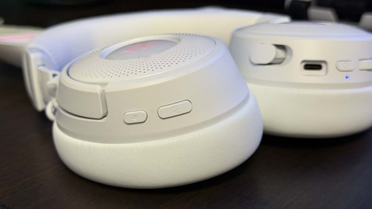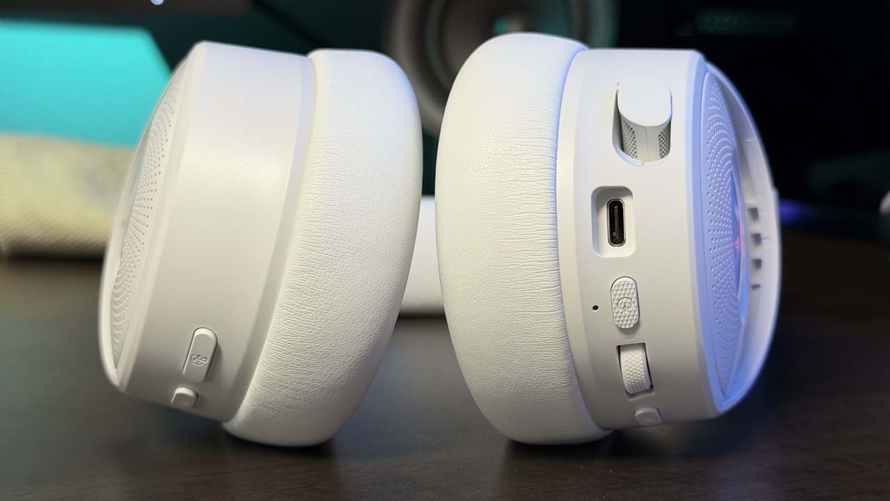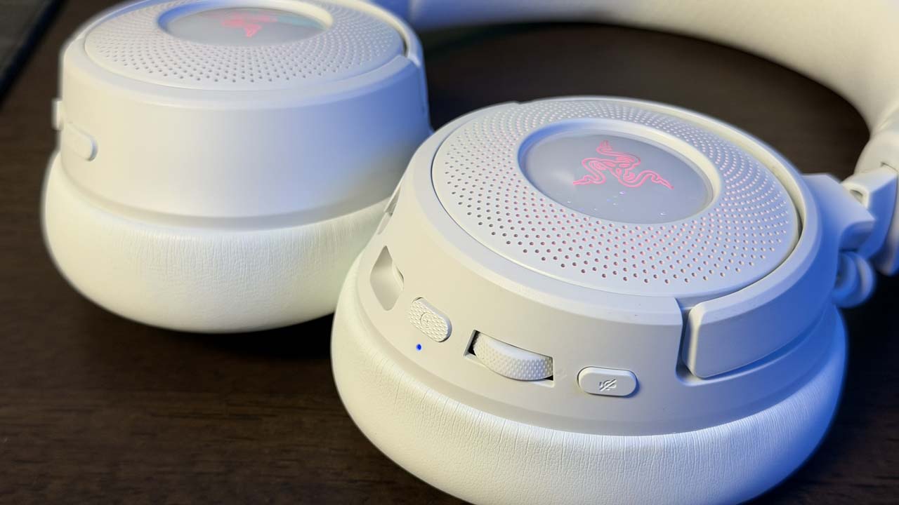 Côté commandes, Razer a opté pour une disposition complète et intuitive. Sur l’oreillette gauche, on retrouve une molette de volume crantée, un bouton d’alimentation texturé et un interrupteur pour le mode mute du micro. L’oreillette droite regroupe quant à elle le bouton de balance jeu/chat et l’activation du mode Smartswitch, permettant de basculer entre les profils audio ou les modes de connectivité. Cette répartition permet un accès rapide, mais certaines limitations subsistent : impossible par exemple de reprogrammer la balance jeu/chat, contrairement au bouton Smartswitch modifiable via le logiciel Synapse.
