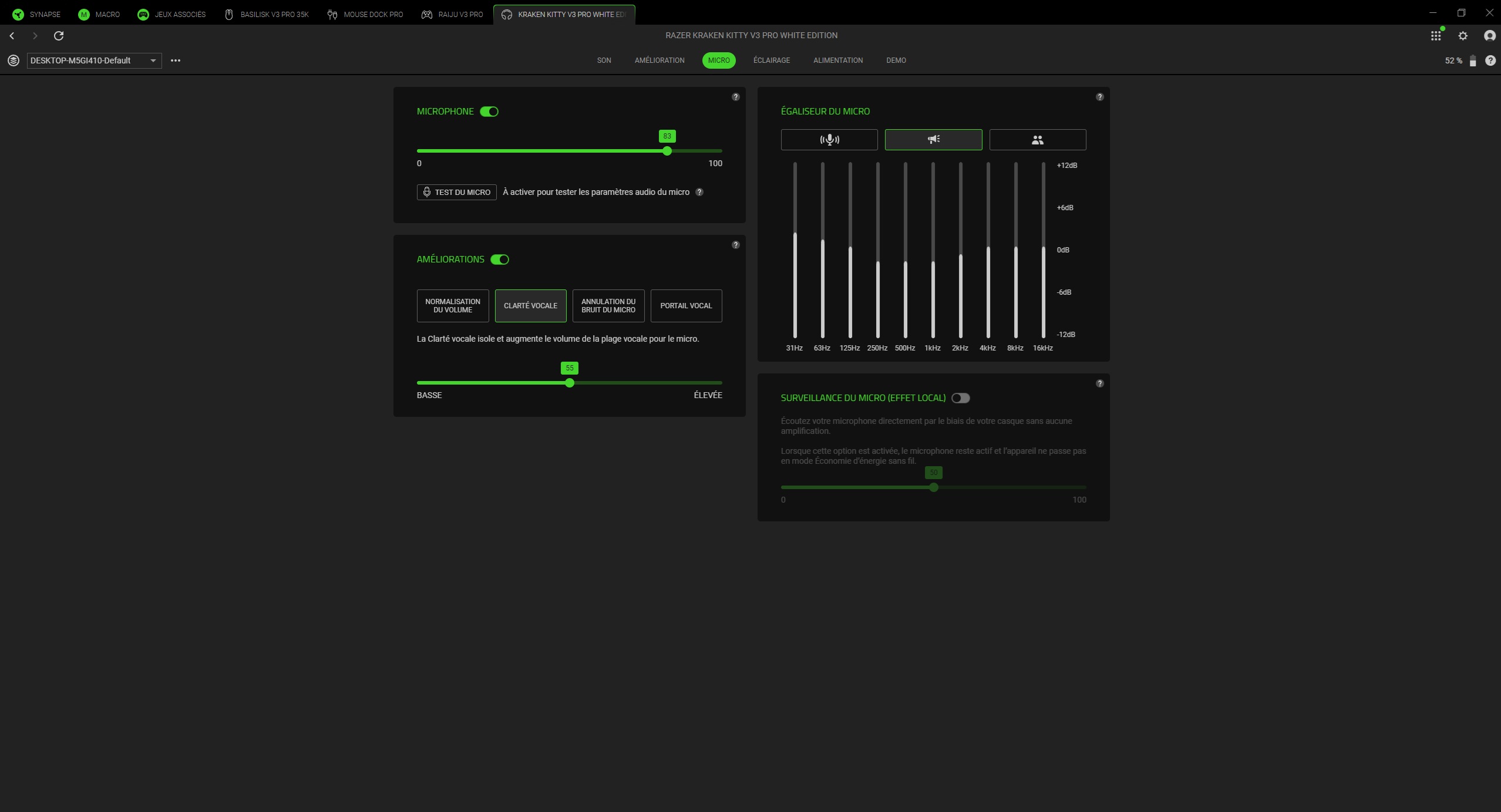 Le microphone HyperClear Super Wideband, intégré en version rétractable, s’en sort mieux qu’attendu. Comparé à d’autres modèles Razer récents, celui-ci offre une capture vocale nette, avec une bonne restitution des aigus. Les voix ressortent sans saturation ni effet métallique trop marqué, bien que les basses manquent parfois de rondeur. Le résultat est particulièrement efficace pour le streaming ou les appels vocaux prolongés, où la stabilité du rendu prime sur la richesse spectrale.