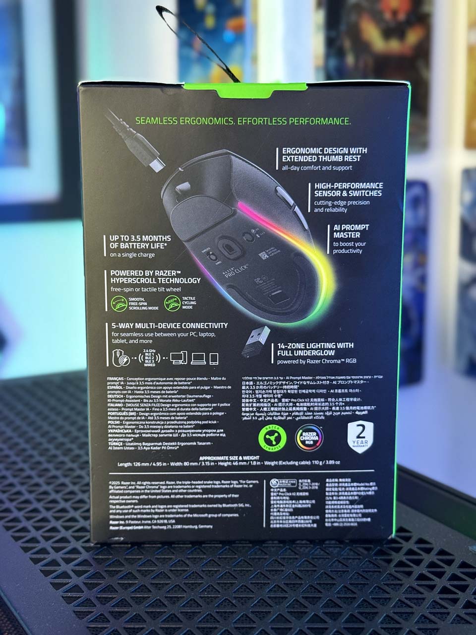 Au-delà de ses performances techniques, la RAZER Pro Click V2 soigne aussi l’apparence visuelle avec un système d’éclairage RGB à 14 zones. Situé sous la base de la souris, cet effet de sous-brillance crée une ambiance lumineuse personnalisable qui vient enrichir l’esthétique de n’importe quel setup.