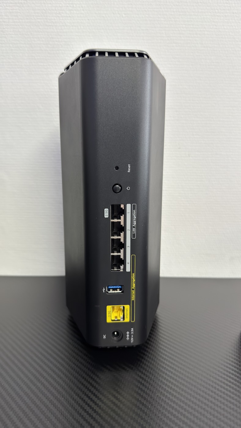 L’arrière du routeur offre une connectique complète, incluant un port WAN 2.5Gbit pour une connexion Internet rapide, quatre ports Ethernet (dont un en 2.5Gbit et trois en 1Gbit) avec possibilité d’agrégation pour un NAS, un port USB 3.0 permettant le partage de fichiers sur le réseau domestique, un bouton de réinitialisation et un interrupteur d’alimentation. L’ensemble respire la solidité et affiche une construction plus massive que le RS200, renforçant l’impression de fiabilité.