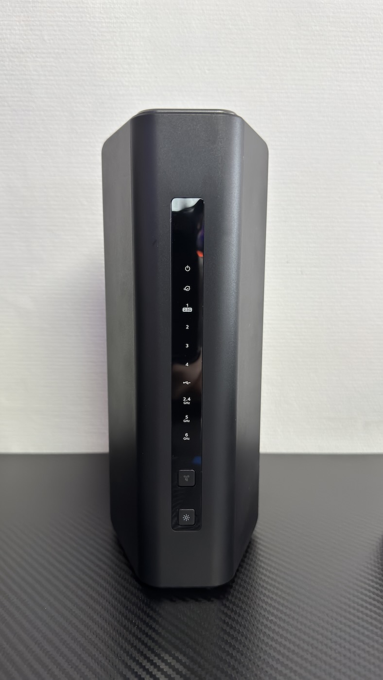 Sur la face avant, plusieurs LED permettent de visualiser l’état des connexions, notamment les indicateurs pour les bandes Wi-Fi 2.4 GHz, 5 GHz et 6 GHz, ainsi que l’état du réseau et des ports Ethernet. On retrouve également un bouton WPS qui simplifie la connexion des appareils sans mot de passe.